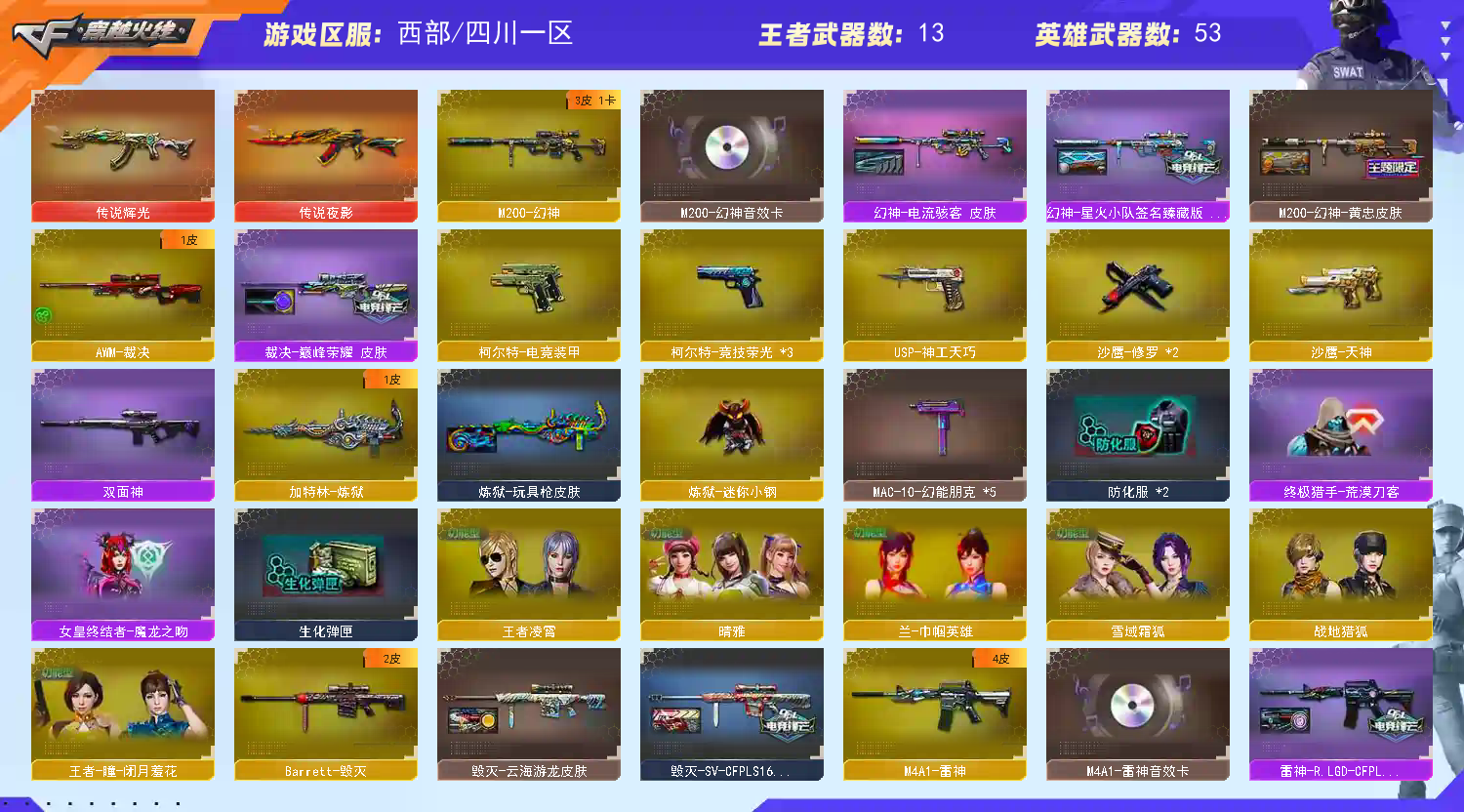 【m200-幻神+音效卡+电流骇客+星火小队+幻神-黄忠】 【王者星神】 【传说夜影】 【传说辉光】 【白虎之魄】 【火麒麟】 【雷神+音效卡+雷神-lgd18冠军】 【黑骑士+音效卡】 【毁灭】 【裁决+巅峰荣耀】 【王者之势 王者龙血】 【黑鲨】 【10手呛 修罗*2 天神 usp神工天巧】 【9近战 屠龙 擎天 麒麟刺 炽芒蝶刃蝴蝶刀*2】 【手雷 电竞装甲 幻灵雷 竞技荣光 神工天巧】 【四防 兰巾帼英雄 晴雅 王者凌霄】;炽芒蝶刃,晴雅,M200-幻神,