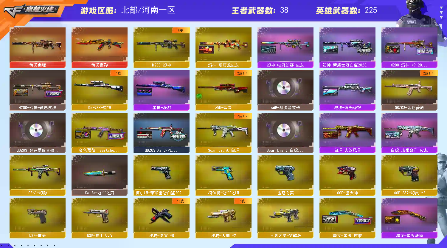 玩游戏就好好玩。不要动我的cf点以及赛季cf点,做个有素质的人。不要恶意挂机,乱发语音,举报别人,存在任何演员行为,不收押金别给我瞎搞。;USP-雷暴,柯尔特-荣耀世冠白鲨2023,柯尔特-冠军之特,炽芒蝶刃,Knife-冠军之刃,隼,晴雅,