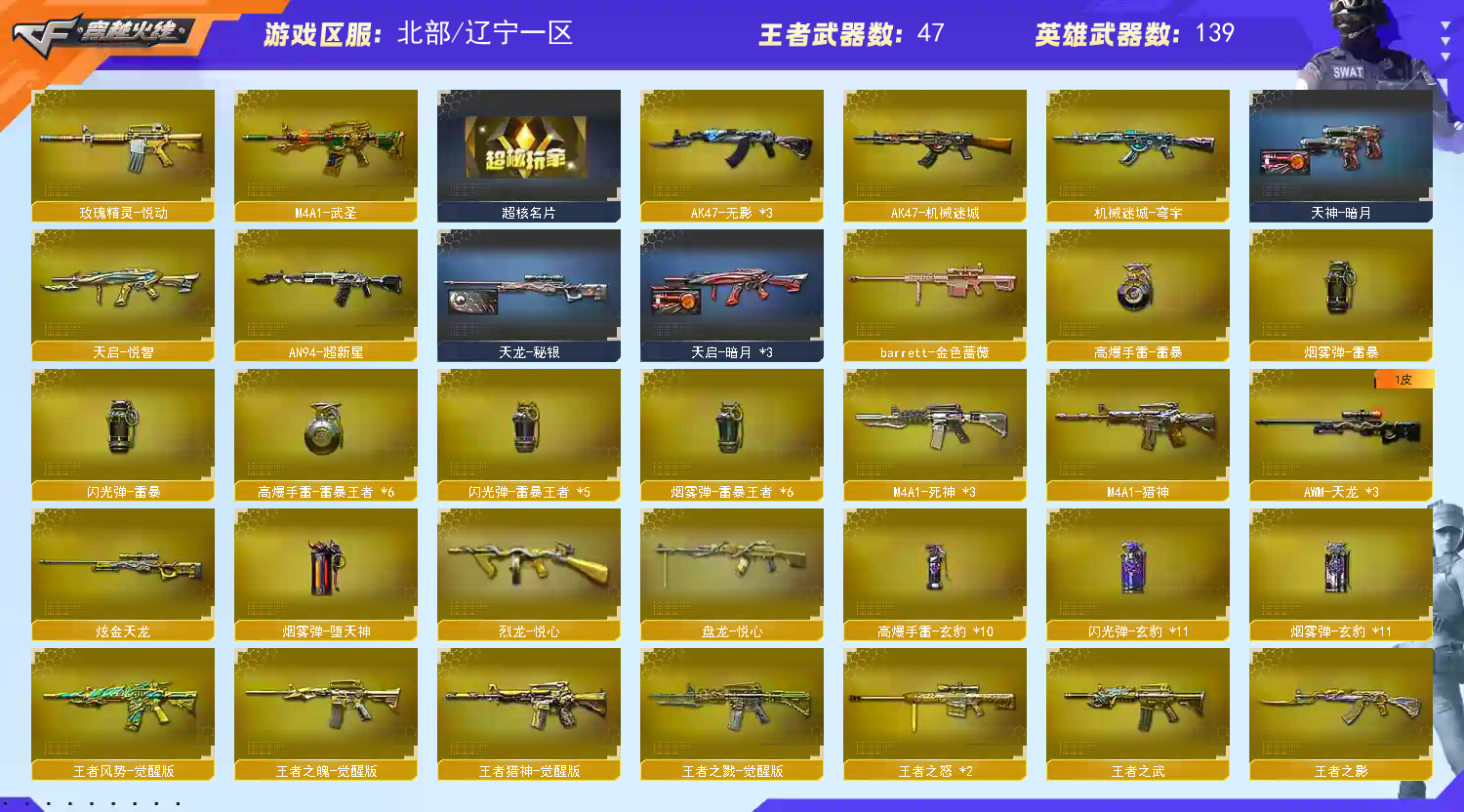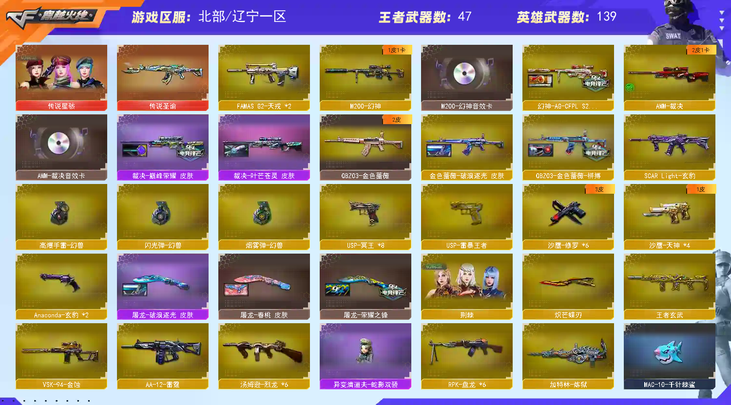 金名 幻兽套 qbz拼搏 10玄豹套 裁决三件套 8usp冥王 1usp雷暴王者 法玛斯天戎 雷暴王者 3把柯尔特1911 老海豹 王者冰锋 神秘礼盒背包 传说圣谕 传说星骇 玄豹套 王者凌虎 金蚀 6盘6烈 异变清道夫蛇影双娇 炽芒蝶刃 荆棘 机械姬 叶芒苍灵 幻神三件套 裁决三件套 毁灭三件套;USP-雷暴王者,炽芒蝶刃,传说星骇,RPK-盘龙,QBZ03-金色蔷薇,M200-幻神,传说圣谕,