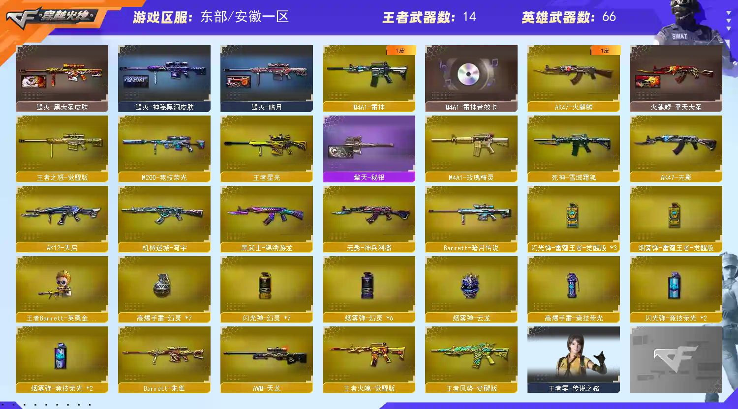 【安徽一区】元帅VIP6幻神【星耀+周瑜】+竞技荣光+传说幽冥*2【沙鹰修罗】+QBZ金色蔷薇【Heartshot】+AWM裁决+98K星神+USP雷暴+柯尔特竞技荣光*2+COP雷霆王者 【77V】 稀有武器:传说幽冥*2 M200幻神 M200竞技荣光 98K星神 AWM裁决 QBZ03金色蔷薇 火麒麟 雷神 无影 天启 天龙 巴雷特朱雀 巴雷特暗夜传说 AA12雷霆 USP雷暴 柯尔特竞技荣光*2 COP雷霆王者 屠龙*3 龙啸 擎天 尼泊尔雷霆 幻灵之锋 擎天竞技荣光*2 雷霆王者之锋2 死神雪域霜狐 觉醒王者:王者火魄 王者风势 王者之怒 王者星光 稀有人物:审判者 研 魅影 战地猎狐 乔伊教练 蛇隐宗 王者魅影 王者涂鸦 王者云悠悠 王者炫 学弟霜狐 音效卡:雷神音效卡 极光音效卡 死神雪域霜狐音效卡 小人枪:毁灭孙三炮 王者巴雷特英勇金戈 COP白鲨 雷套:幻灵套*6 竞技荣光套*1 雷霆王者套*1 稀有皮肤:幻神星耀 幻神周瑜 金色蔷薇Heartshot 毁灭Heartshot 毁灭暗月 毁灭霓虹风暴 毁灭神秘黑洞 毁灭青帝 毁灭黑大圣 极光能量核心 极光高能霹雳 黑骑士暗月 黑骑士摸金校尉 擎天秘银 擎天蒸汽钟表 屠龙破浪逐光 屠龙春桃 屠龙荣耀之锋 修罗CFSTAR*2 火麒麟CFSTAR 火麒麟齐天大圣 雷神白鲨CFPLS14冠军;USP-雷暴,传说幽冥,QBZ03-金色蔷薇,M200-幻神,Kar98K-星神,