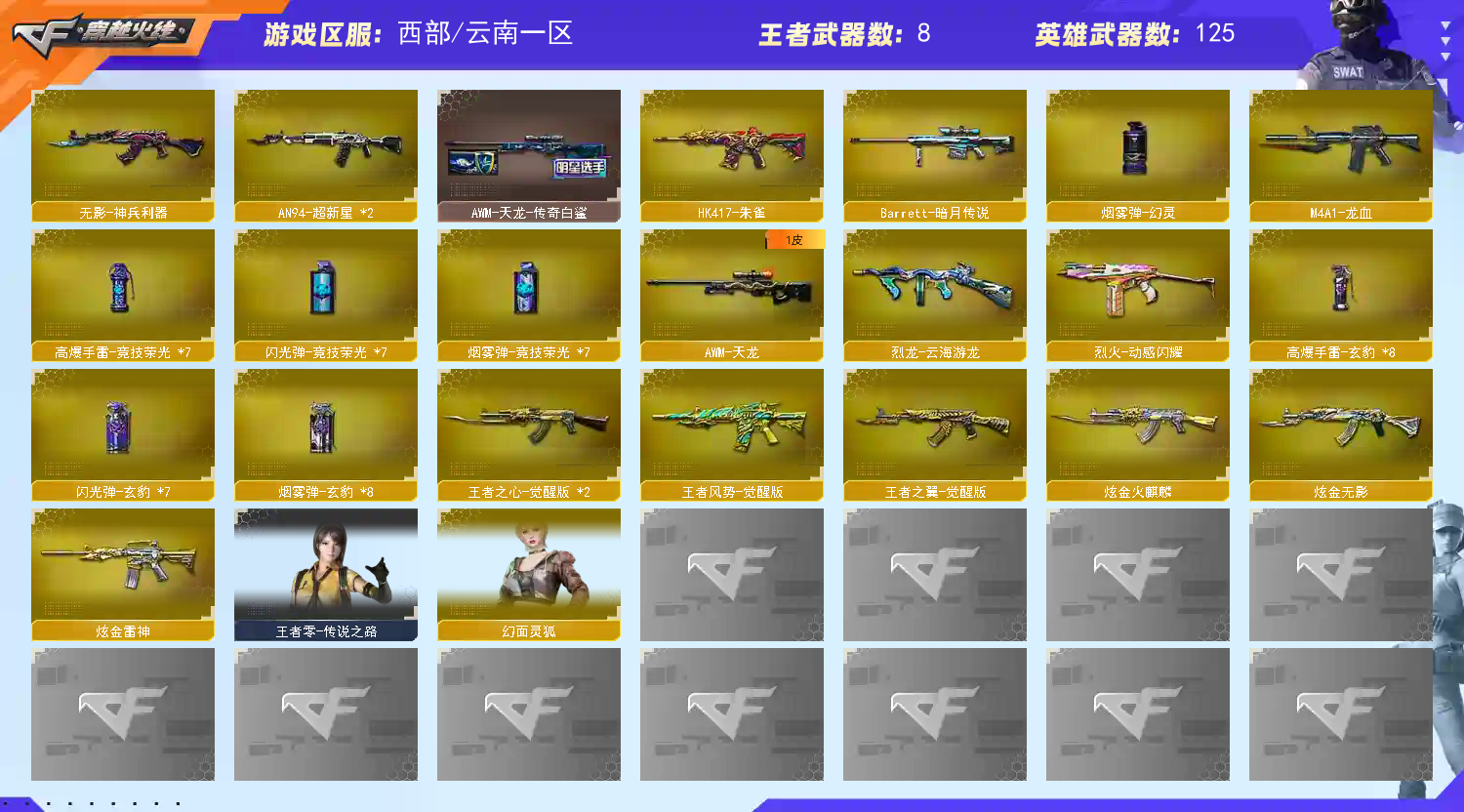 恶意退排位拉黑;USP-雷暴,柯尔特-荣耀世冠白鲨2023,Knife-冠军之刃,传说星骇,隼,电竞教官-云悠悠,晴雅,