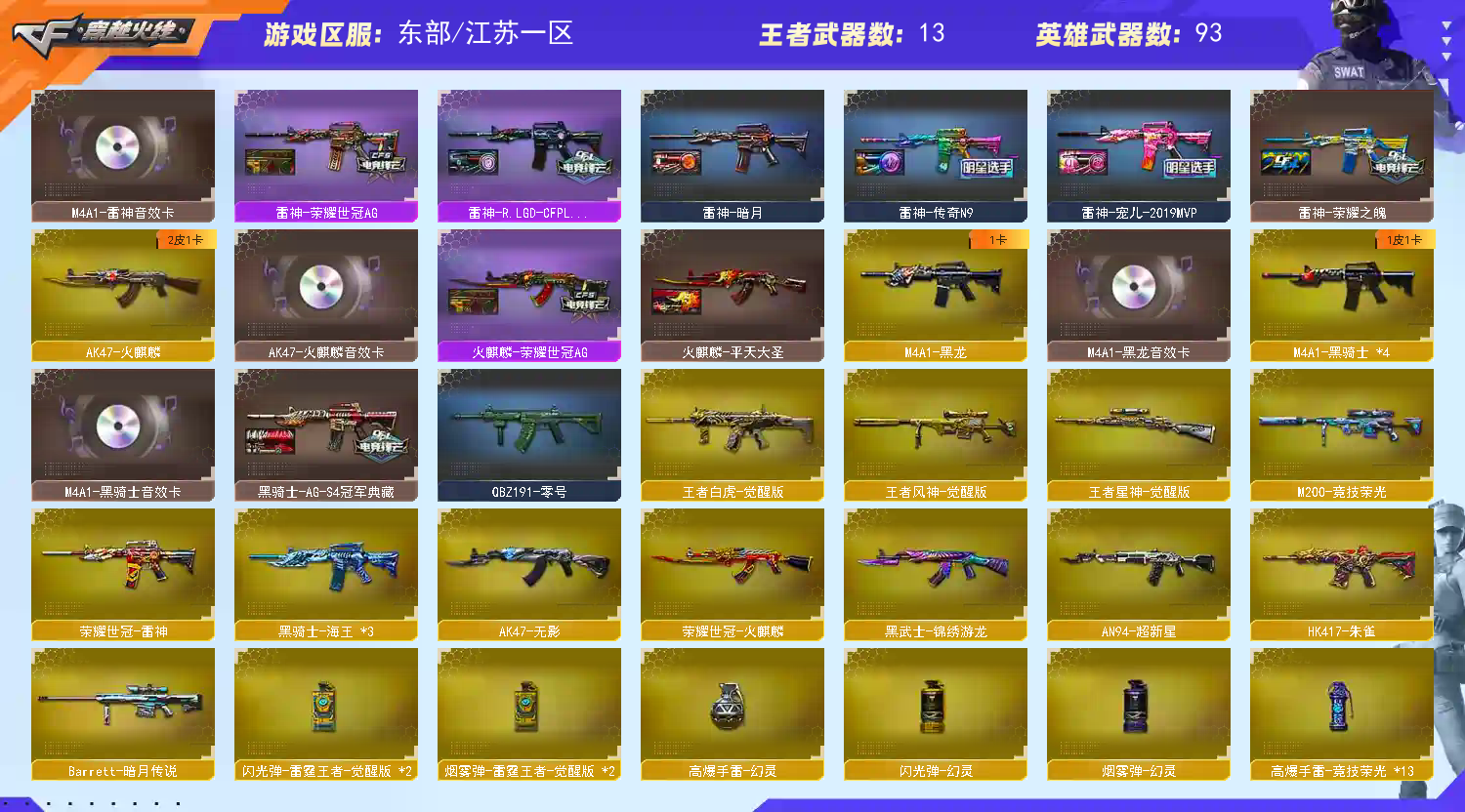 【东部】🌟93v幻神三皮带卡🌟白虎带卡🌟王者星神🌟usp雷暴🌟王者白虎🌟王者风神;USP-雷暴,荣耀世冠-柯尔特,隼,电竞教官-云悠悠,QBZ03-金色蔷薇,M200-幻神,Scar Light-白虎,