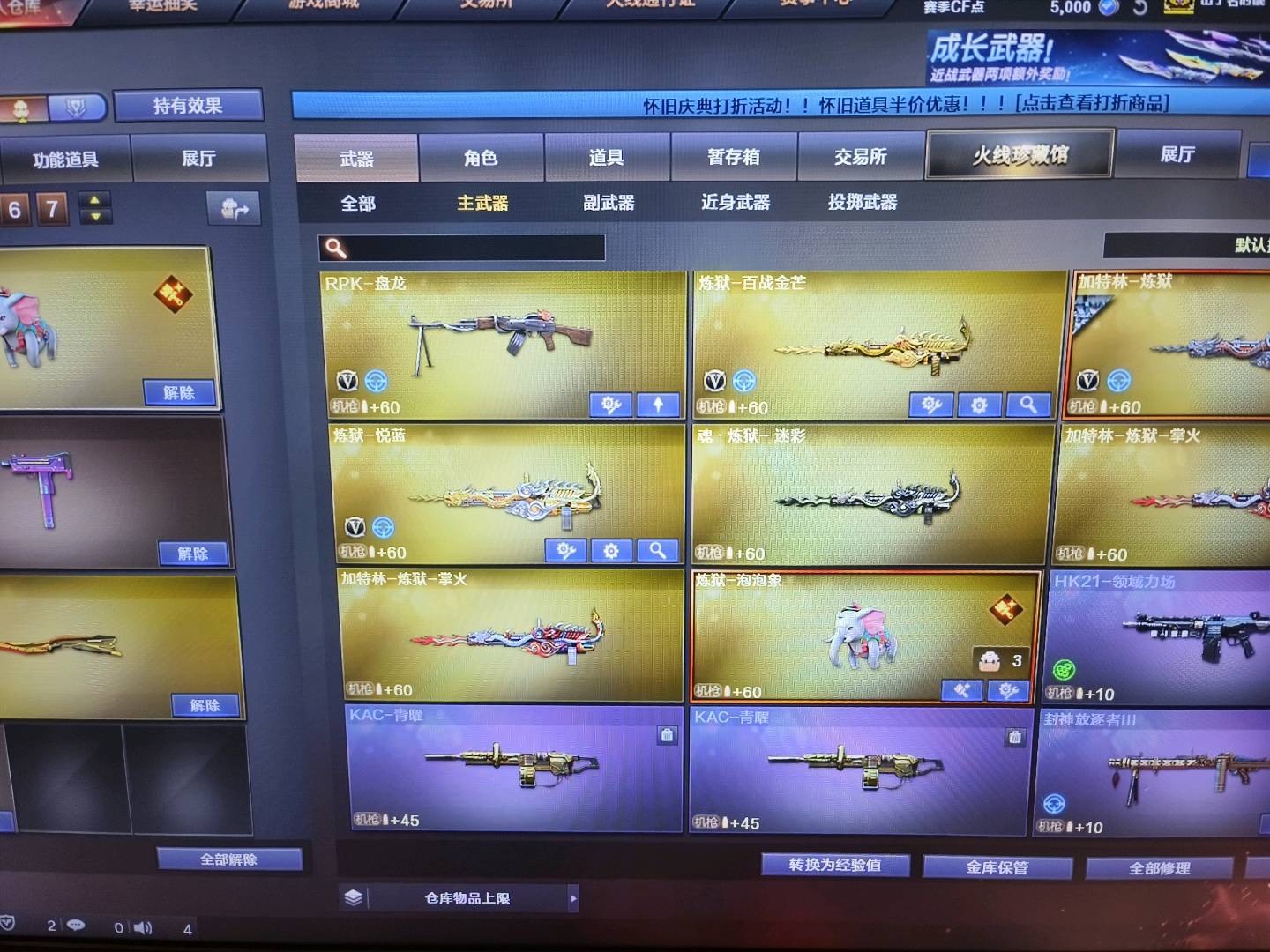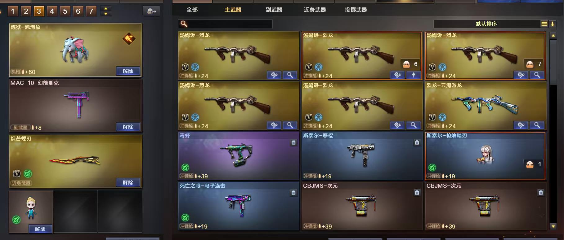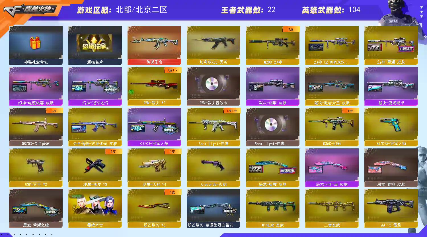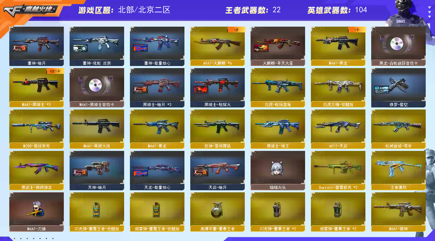 生化排位都能玩;柯尔特-冠军之特,炽芒蝶刃,RPK-盘龙,QBZ03-金色蔷薇,G36C-幻影,炼狱-泡泡象,M200-幻神,