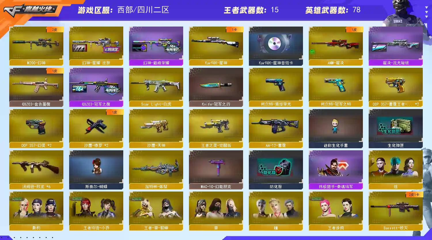 幻神✨六烈龙✨星神✨朱雀白虎✨幻灵✨金色蔷薇✨雷霆王者✨四防影豹✨葵✨瞳✨乔伊教练✨王者-葵-貂蝉✨王者玲珑-小乔✨星神音效卡✨毁灭音效卡✨黑骑士音效卡;柯尔特-冠军之特,Knife-冠军之刃,QBZ03-金色蔷薇,M200-幻神,Scar Light-白虎,Kar98K-星神,