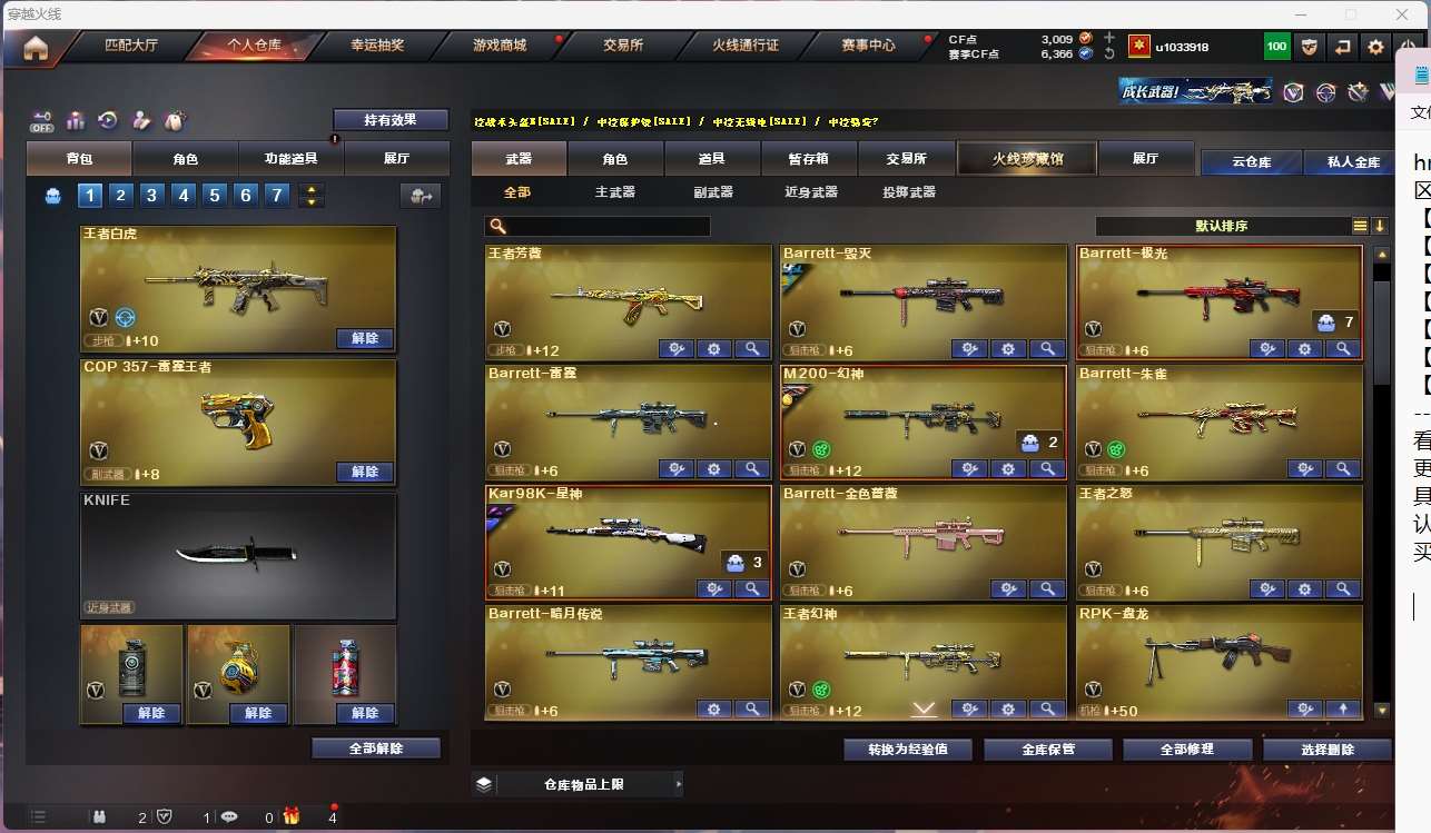 【亮点解析 四防女帝 幻神三件套 】【四防传说女帝 】【m200幻神+音效卡 +ag17冠军+周瑜】【98k星神+漫游】【王者幻神 】【5烈龙 炼狱 盘龙*4 死亡之眼 】【传说光耀】【王者白虎】【qbz金色蔷薇+卡+ag19冠军+巅峰荣耀】【火麒麟+卡】【黑龙】【雷神+卡+宠儿+s18冠军】【毁灭+卡+荣耀之怒 】【极光】【雷霆套 】 【武器:雷霆 王者之心 王者之戮 王者火魄 雷霆王者 qbz王者蔷薇 王者芳薇 王者之怒 】 【8手呛:修罗*2 雷霆*3 幻灵 雷霆王者 天神 】 【9刀具:屠龙*4 龙啸 擎天 麒麟刺 尼泊尔雷霆 幻灵之峰 雷霆王者 】 【12雷套:雷霆雷*7 幻灵雷*5】 【小人呛:雷神小红】 【音效卡:幻神音效卡 火麒麟音效卡 金色蔷薇音效卡 毁灭音效卡 雷神音效卡 】 【角色:影豹 炫 樱 】;传说女帝,RPK-盘龙,QBZ03-金色蔷薇,M200-幻神,Kar98K-星神,