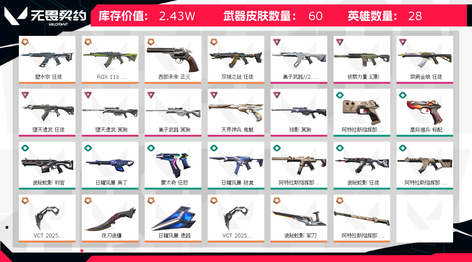 vct爪刀、夜刃诡镰、天界鬼魅、侦查幻影、紫金离子、显卡、堕天、双城、塑水宗狂徒,堕天、离子、掠夺狙,西部正义。允许 英雄25 武器皮肤数量57;VCT 2025 爪刀,侦察力量 幻影,紫阙金琅 狂徒,RGX 11z Pro 狂徒,堕天遗武 狂徒,塑水宗 狂徒,离子武器//2.0 狂徒,