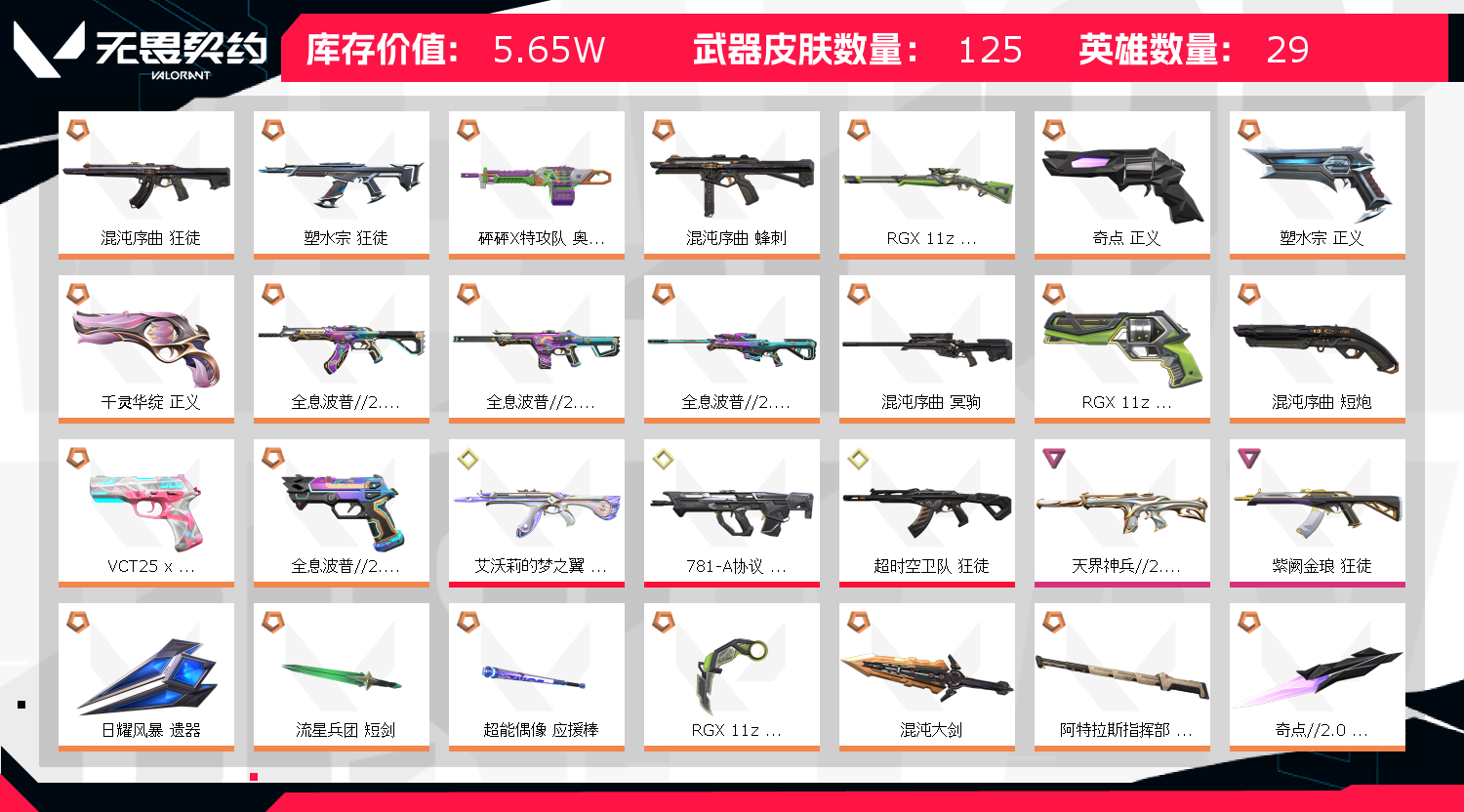 允许 英雄27 武器皮肤数量121;砰砰X特攻队 奥丁,天界神兵//2.0 幻影,紫阙金琅 狂徒,混沌序曲 狂徒,塑水宗 狂徒,混沌序曲 蜂刺,RGX 11z Pro//3.0 莽侠,