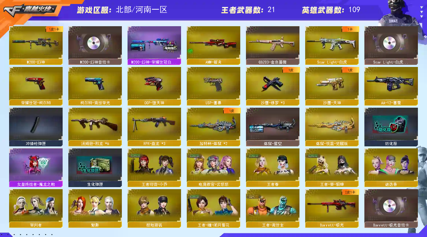 幻神荣耀世冠白鲨+音效/竞技荣光悠悠王者春貂蝉幽/雷暴堕天神荣耀世冠/白虎蔷薇朱雀8音效8烈3盘3炼狱/幻神音效卡/白虎音效卡/极光音效卡;USP-雷暴,荣耀世冠-柯尔特,电竞教官-云悠悠,RPK-盘龙,QBZ03-金色蔷薇,M200-幻神,Scar Light-白虎,