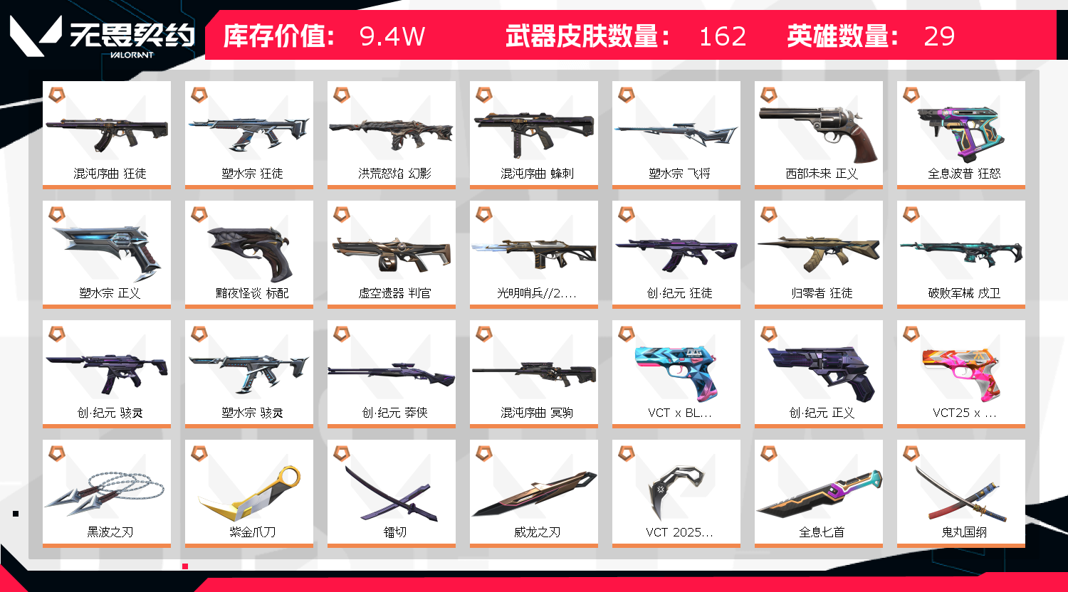 9.4万库存♥塑水宗套♥威龙之刃♥22冠军套♥vct爪刀♥创纪元套♥星守奥丁♥天界鬼魅♥混沌序曲套