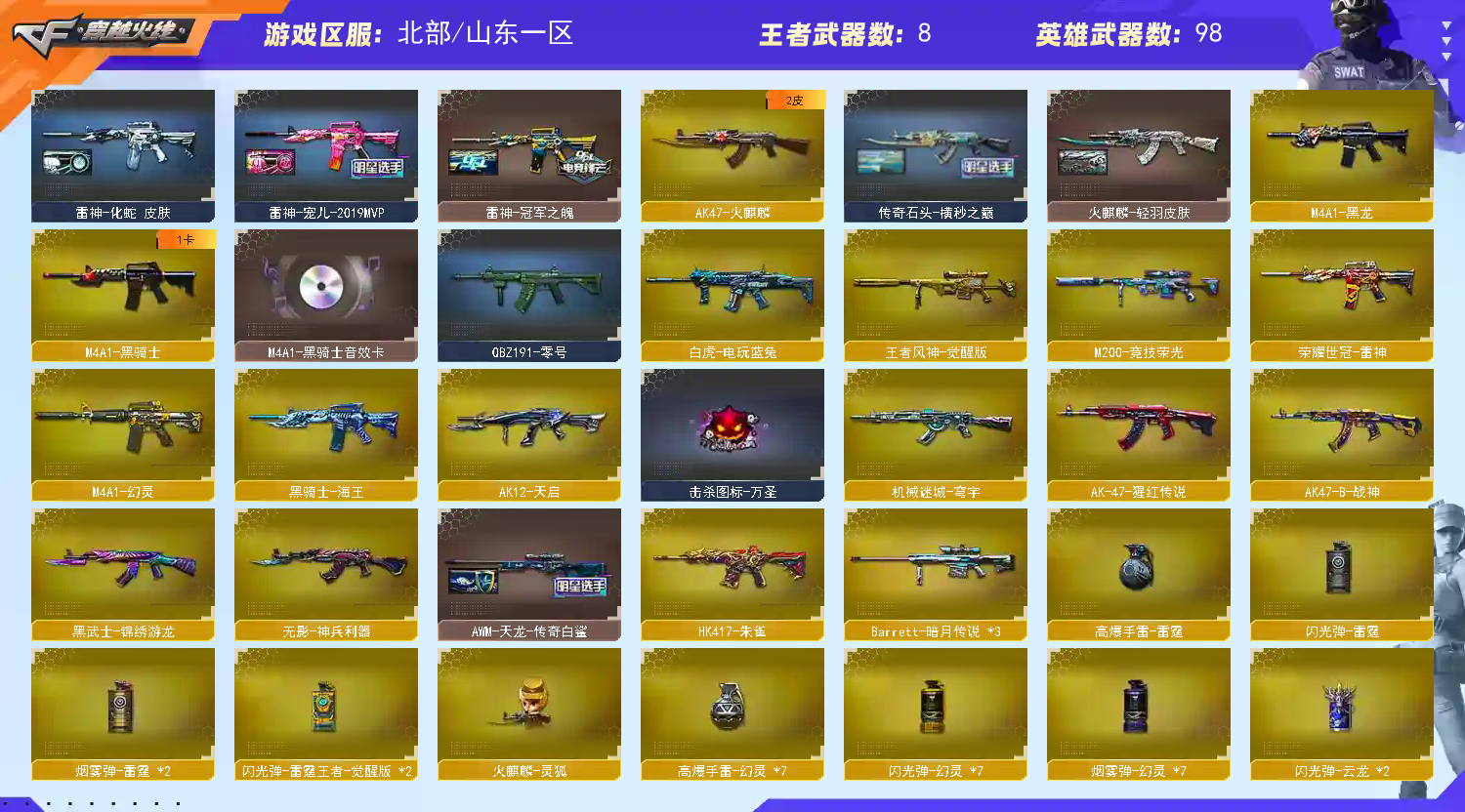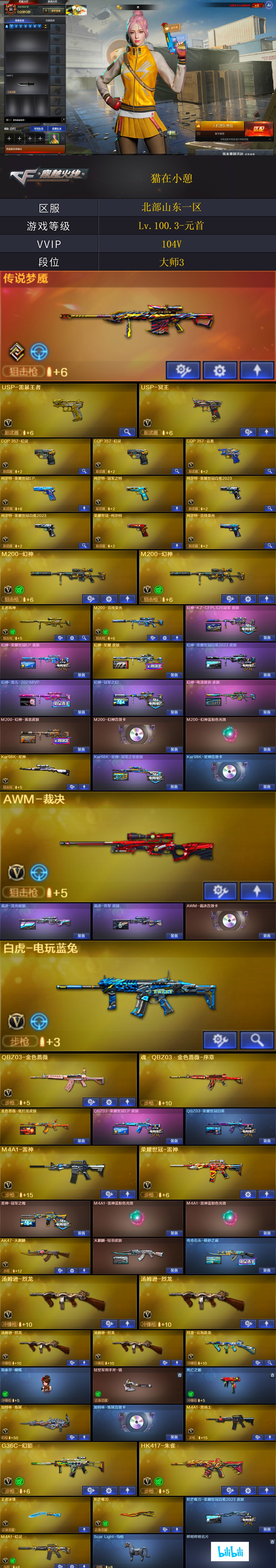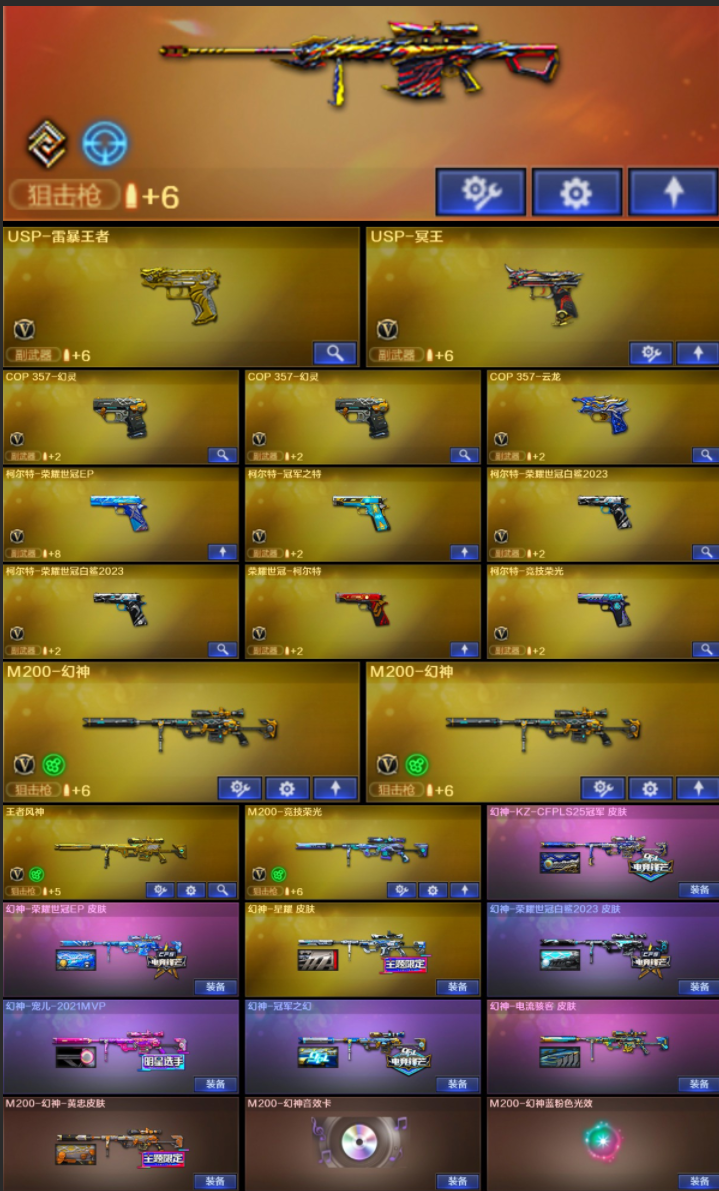 【稀有武器】:传说梦魇/M200-幻神(2)/Kar98K-星神/G36C-幻影/HK417-朱雀/M4A1-幻灵/COP357-幻灵(2)/柯尔特-竞技荣光/COP357-云龙/柯尔特-荣耀世冠白鲨2023(2)/修罗-古蛇迷踪/荣耀世冠-柯尔特/金色蔷薇-古蛇迷踪/QBZ03-金色蔷薇/AK47-火麒麟/M4A1-黑龙/M4A1-雷神(2)/M4A1-黑骑士/荣耀世冠-雷神/白虎-电玩蓝兔/Barrett-毁灭/AWM-裁决/M200-竞技荣光/加特林-炼狱/汤姆逊-烈龙(4)/炽芒蝶刃/幻灵之锋/擎天-竞技荣光 【王者武器】:王者之光-觉醒版/王者风神-觉醒版 【热门角色】:鹰/影豹/奇洋探员/乔伊教练/蛇隐宗/王者春/王者-魅影/王者空/王者涂鸦/炽天使/潘多拉-X/兔囡囡 【热门音效卡】:M200-幻神音效卡/Kar98K-星神音效卡/AWM-裁决音效卡/HK417-朱雀音效卡/加特林-炼狱音效卡/Barrett-毁灭音效卡/M4A1-黑骑士音效卡 【热门皮肤】:幻神-星耀皮肤/幻神-荣耀世冠白鲨2023皮肤/幻神-宠儿-2021MVP/幻神-电流骇客皮肤/金色蔷薇-纸灯龙皮肤/毁灭-星耀皮肤/屠龙-星火燎原/裁决-羽掣皮肤/Kar98K-星神-冠军之星皮肤/屠龙-破浪逐光皮肤/裁决-流光秘银/传奇石头-横秒之巅/QBZ03-荣耀世冠白鲨/炽芒蝶刃-荣耀世冠白鲨2023皮肤/屠龙-春桃皮肤/雷神-冠军之魄 【其他亮点】:斯泰尔-蝴蝶/Scar Light-马枪/金刚伞-电玩红兔/M14EBR-冠军金牛/烟雾弹-荣耀世冠白鲨2023/哔哩哔哩名片 (截图展示段位不代表实际段位,如赛季更新等不可抗拒因素发生变化,其余道具看截图或咨询客服);USP-雷暴王者,荣耀世冠-柯尔特,柯尔特-荣耀世冠白鲨2023,柯尔特-冠军之特,炽芒蝶刃,妮妮,QBZ03-金色蔷薇,