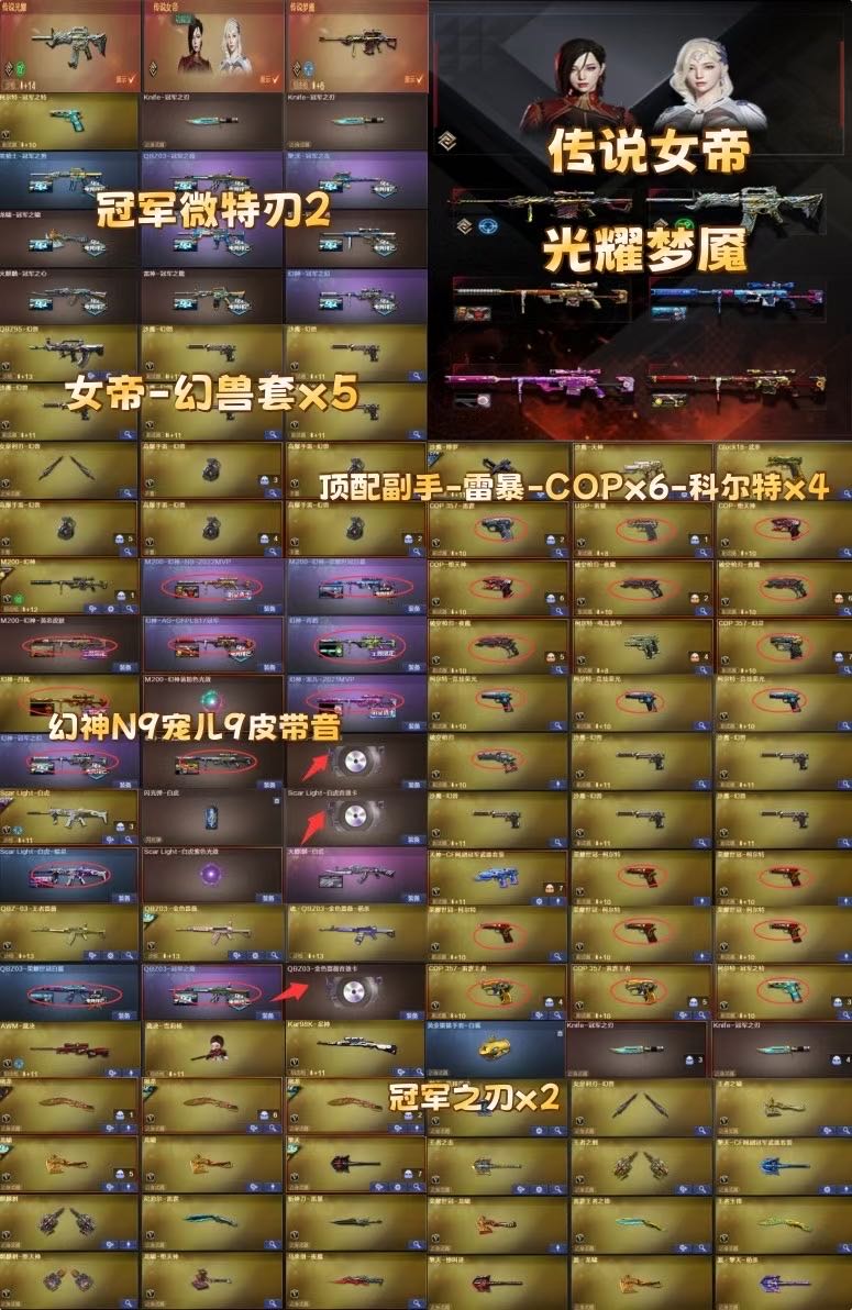 女帝幻兽幻神N9宠儿冠军9皮带音❤顶配副手-薇特刃2❤6盘蝴蝶;USP-雷暴,荣耀世冠-柯尔特,柯尔特-冠军之特,Knife-冠军之刃,传说女帝,电竞教官-云悠悠,RPK-盘龙,