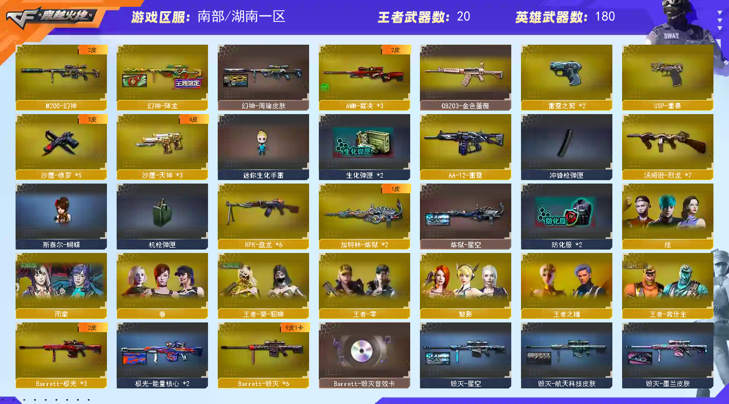 爆破生化全装。王者六盘炼狱。八烈斯太尔蝴蝶。炫金火麒麟。炫金雷神。炫金天龙。炫金千变。王者,势,心,武,魄,怒,翼,幻。角色有魅影,春,炫。王者之瞳,王者救世主。零-水下丽影。兰-海滩派对,灵狐者,黄金海岸。毁灭黑骑士火麒麟有音效卡。其他看截图;USP-雷暴,RPK-盘龙,QBZ03-金色蔷薇,M200-幻神,