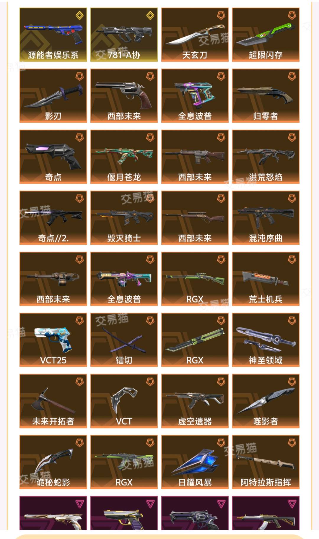 允许 英雄27 武器皮肤数量121;西部未来 奥丁,镭切,VCT 2025 爪刀,起源 雄鹿,盖亚的复仇 狂徒,虚空遗器 狂徒,掠影 戍卫,