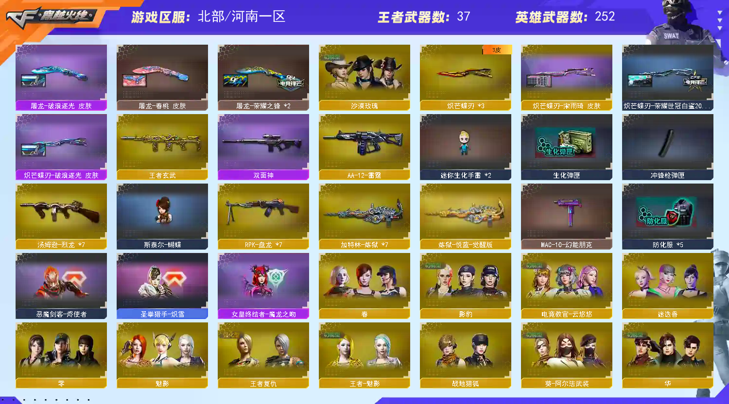 【稀有武器】:传说光耀/传说暗裔/传说辉光/传说幽瞳/传说幽冥(2)/M200-幻神/G36C-幻影/ScarLight-白虎(2)/M4A1-青龙/M4A1-幻灵/AK47-雷暴/M4A1-堕天神/USP-雷暴/COP-堕天神(2)/破空枪刃-夜魔/柯尔特-电竞装甲/COP357-幻灵(2)/柯尔特-竞技荣光/天神-动感闪耀/COP357-云龙/柯尔特-荣耀世冠白鲨2023/修罗-古蛇迷踪/荣耀世冠-柯尔特/COP357-雷霆王者-觉醒版(2)/王者破空枪刃/金色蔷薇-古蛇迷踪/QBZ03-云龙/QBZ03-金色蔷薇(3)/AK47-火麒麟(4)/AK47-麒麟/M4A1-黑龙/M4A1-雷神(6)/M4A1-黑骑士(3)/AK47-无影/AK47-黑武士/荣耀世冠-火麒麟/荣耀世冠-雷神/白虎-电玩蓝兔/Barrett-毁灭/Barrett-极光(2)/AWM-裁决/Barrett-电竞装甲/M200-竞技荣光/RPK-盘龙(7)/加特林-炼狱(7)/汤姆逊-烈龙(7)/AA-12-雷霆/炽芒蝶刃(3)/斩神刀-雷暴/麒麟刺-堕天神(2)/龙啸-堕天神/尼泊尔-电竞装甲/幻灵之锋/擎天-竞技荣光/云龙扇 【王者武器】:王者之心-觉醒版/王者之魄-觉醒版/M4A1-雷霆王者-觉醒版/王者之光-觉醒版/王者之力-觉醒版/王者之决-觉醒版/王者破空枪刃/王者之心/王者雷影/王者雷怒/王者星霆 【热门角色】:传说影煞/春/电竞教官-云悠悠/华/迷迭香/沙漠玫瑰/影豹/魅影/乔伊教练/蛇隐宗/王者-魅影/空/灵狐者-职业经理/潘多拉-X/兔囡囡/幽/潘多拉 【热门音效卡】:AWM-裁决音效卡/QBZ03-金色蔷薇音效卡/M4A1-雷神音效卡/Barrett-毁灭音效卡/M4A1-黑骑士音效卡(2)/AK47-火麒麟音效卡/M4A1-黑龙音效卡 【热门皮肤】:幻神-荣耀世冠白鲨2023皮肤/幻神-冠军之幻/幻影-破浪逐光皮肤/QBZ03-CFS2024皮肤/金色蔷薇-破浪逐光皮肤/火麒麟-白虎/擎天-冠军之击/白虎-巅峰荣耀 皮肤/屠龙-破浪逐光皮肤/炼狱-电子连击皮肤/裁决-流光秘银/黑龙-冠军之武/炽芒蝶刃-破浪逐光皮肤/炽芒蝶刃-荣耀世冠白鲨2023皮肤/屠龙-荣耀之锋(2)/雷神-冠军之魄/雷神-荣耀之魄 【其他亮点】:斯泰尔-蝴蝶/MK5-炽火炎龙/贝雷塔687-射手座/金刚伞-电玩红兔/烟雾弹-荣耀世冠白鲨2023/超核名片 (截图展示段位不代表实际段位,如赛季更新等不可抗拒因素发生变化,其余道具看截图或咨询客服);USP-雷暴,荣耀世冠-柯尔特,柯尔特-荣耀世冠白鲨2023,传说幽冥,炽芒蝶刃,沙漠玫瑰,传说影煞,