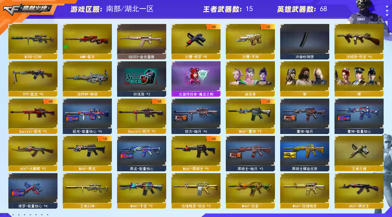 73v-幻神-王者幻神-6盘龙-炼狱-6烈龙-qbz金色蔷薇-毁灭-火麒麟-黑龙-雷神-黑骑士-天龙-❤光-裁决-修罗-天神-屠龙-龙啸-擎天-麒麟刺;RPK-盘龙,QBZ03-金色蔷薇,M200-幻神,