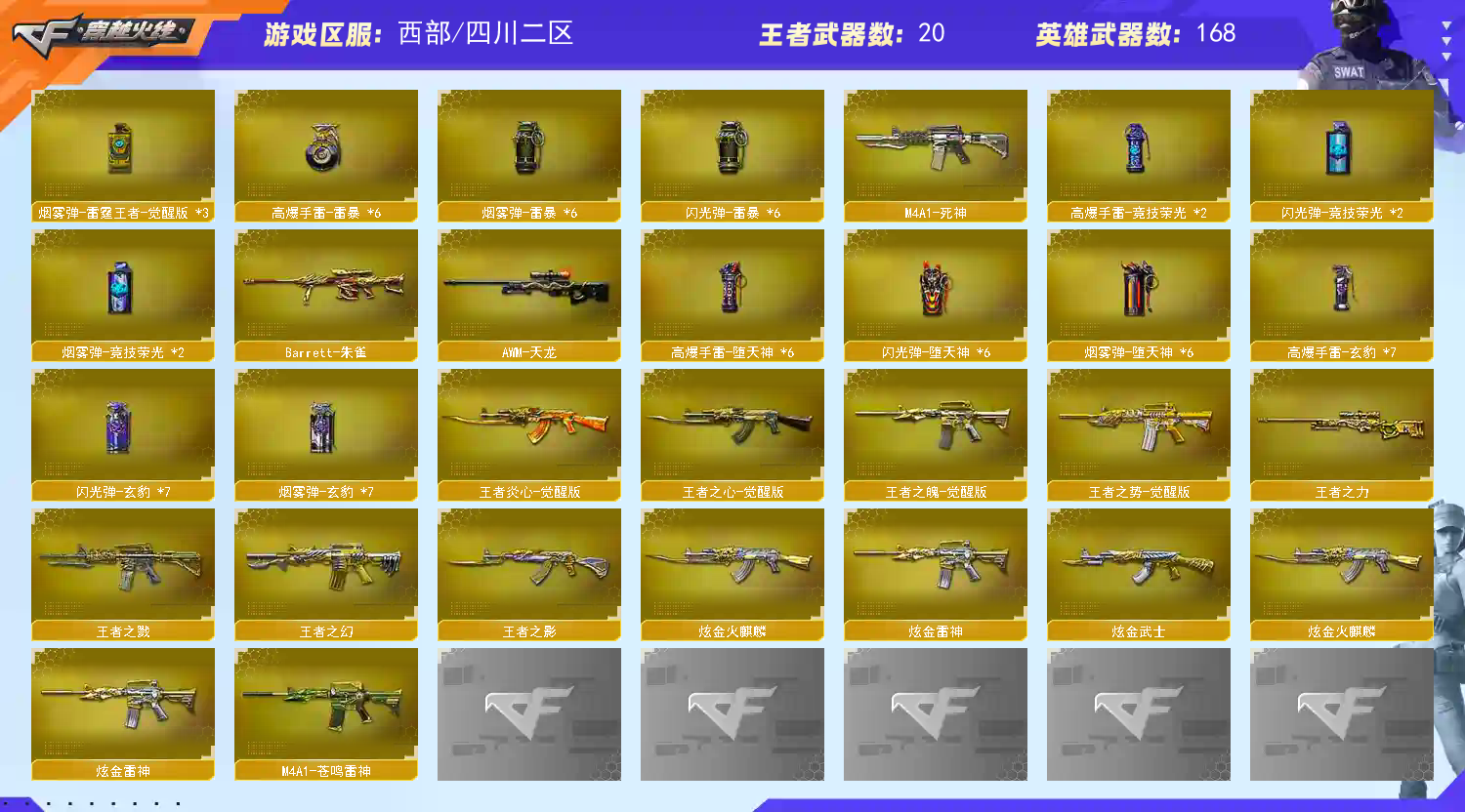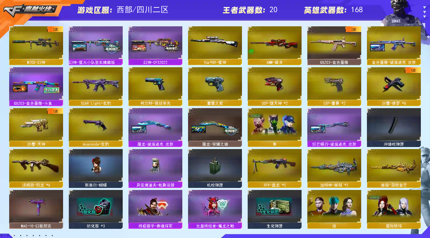 184防隼炽芒蝶刃星神幻神星火小队CFS2022/蔷薇斗鱼火麒麟快手破浪逐光雷神白鲨冠军/雷霆雷暴玄豹堕天竞技荣光雷霆王者/玄豹星际战将灵狐经理/6盘6烈斯泰尔蝴蝶异变清道夫蛇影双骄手斧镜全猎手皮时空猎手机械猎手圣拳猎手生化全装;USP-雷暴,炽芒蝶刃,隼,电竞教官-云悠悠,RPK-盘龙,QBZ03-金色蔷薇,M200-幻神,