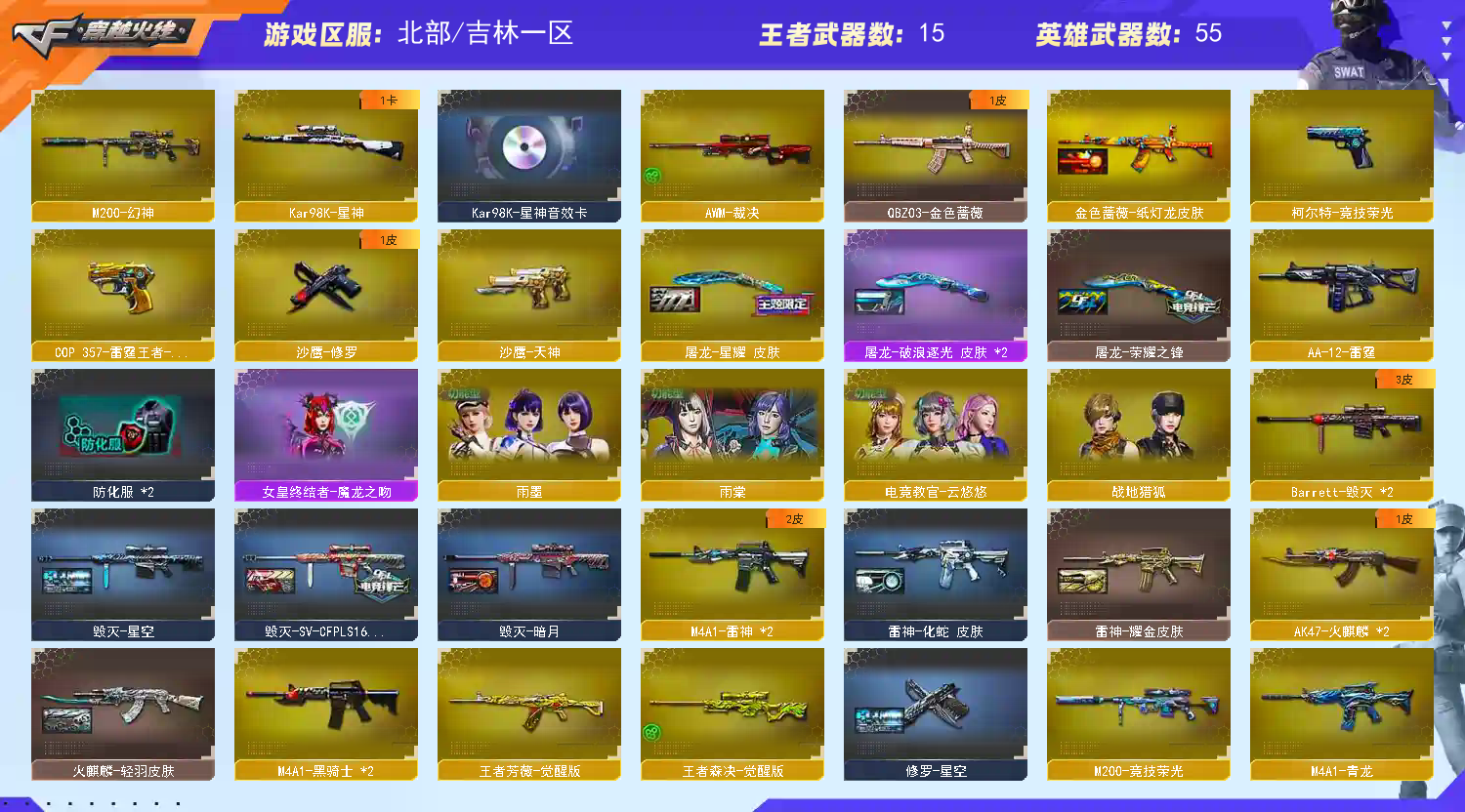 65v-幻神-qbz金色蔷薇-星神-星神音效卡-竞技荣光-王者芳薇-毁灭-裁决-王者森决-AA12雷霆-屠龙-龙啸-擎天-麒麟刺-云悠悠-雨墨-雨棠-qbz纸灯笼-屠龙星耀-荣耀之锋-毁灭sv 请看截图 喜欢请点收藏 方便下次租 可以当成自己号玩【感谢老板租此号】优质账号 如果有个别装备到期 影响不大的情况下请不要维权,如遇到账号密码错误 顶号 冻结 请直接维权即可, 科技大佬麻烦看了请绕道,出zu不易,给你跪下了!;电竞教官-云悠悠,QBZ03-金色蔷薇,M200-幻神,Kar98K-星神,