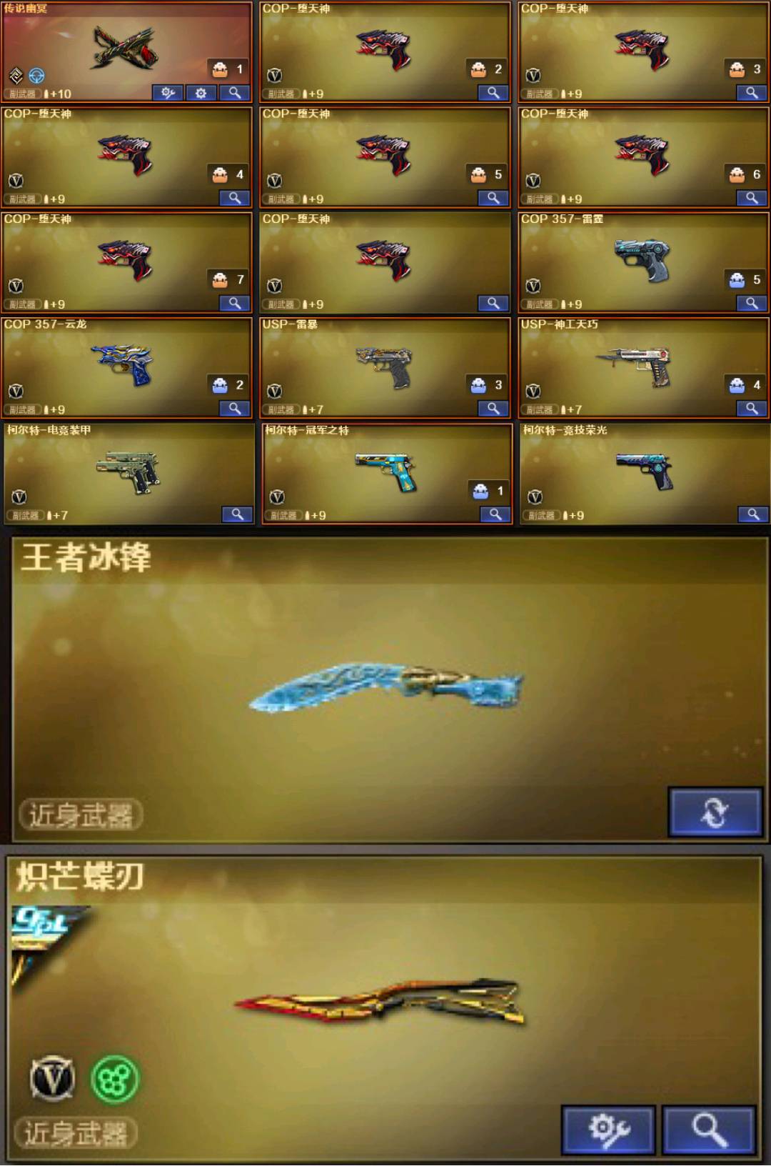 老板玩的开心;USP-雷暴,传说幽冥,柯尔特-冠军之特,炽芒蝶刃,Knife-冠军之刃,沙漠玫瑰,传说星骇,