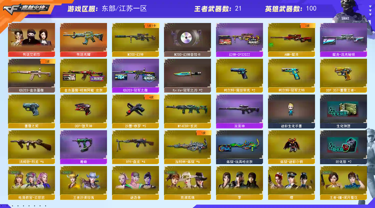 140v-丨传说艾莉莎丨幻神-cfs2022丨传说光耀丨朱雀丨玄武丨qbz丨毁灭丨白虎蓝兔丨竞技荣光丨王者星神丨4盘龙丨6炼狱丨6烈龙丨cop雷霆丨cop堕天神丨柯尔特竞技荣光丨冠军之刃丨屠龙丨龙啸丨擎天丨麒麟刺丨云悠悠丨王者沙漠玫瑰丨荒漠琉璃丨黑龙音效卡丨毁灭音效卡丨火麒麟音效卡丨黑骑士音效卡丨火麒麟枪娘丨火麒麟巅峰荣耀丨冠军之薇丨毁灭AG丨战神关羽丨even丨毁灭cfs2018丨雷神白鲨丨qbz枪娘丨冠军之心丨 请看截图 喜欢请点收藏 方便下次租 可以当成自己号玩【感谢老板租此号】优质账号 如果有个别装备到期 影响不大的情况下请不要维权,如遇到账号密码错误 顶号 冻结 请直接维权即可, 科技大佬麻烦看了请绕道,出zu不易,给你跪下了!;柯尔特-冠军之特,Knife-冠军之刃,电竞教官-云悠悠,王者沙漠玫瑰,传说艾莉莎,RPK-盘龙,QBZ03-金色蔷薇,