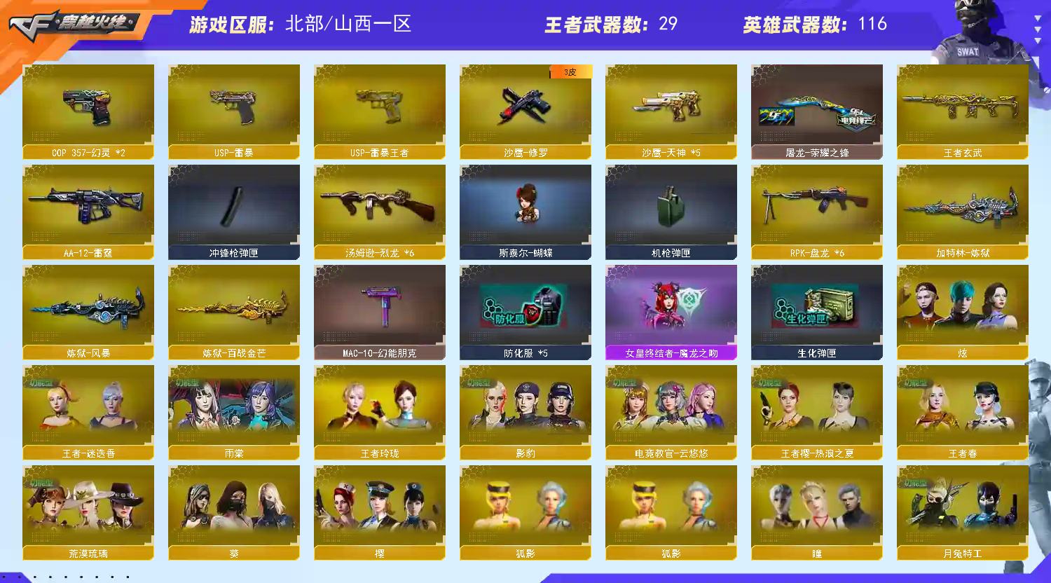 首页 > 租号大厅 > 穿越火线 > 网通区/山西一区 > 北部爆破天花板号🔥七传说女帝星骸⭐十皮幻神裁决白虎蔷薇三件套⭐星神璀璨⭐满配副武器⭐超多皮肤音效卡