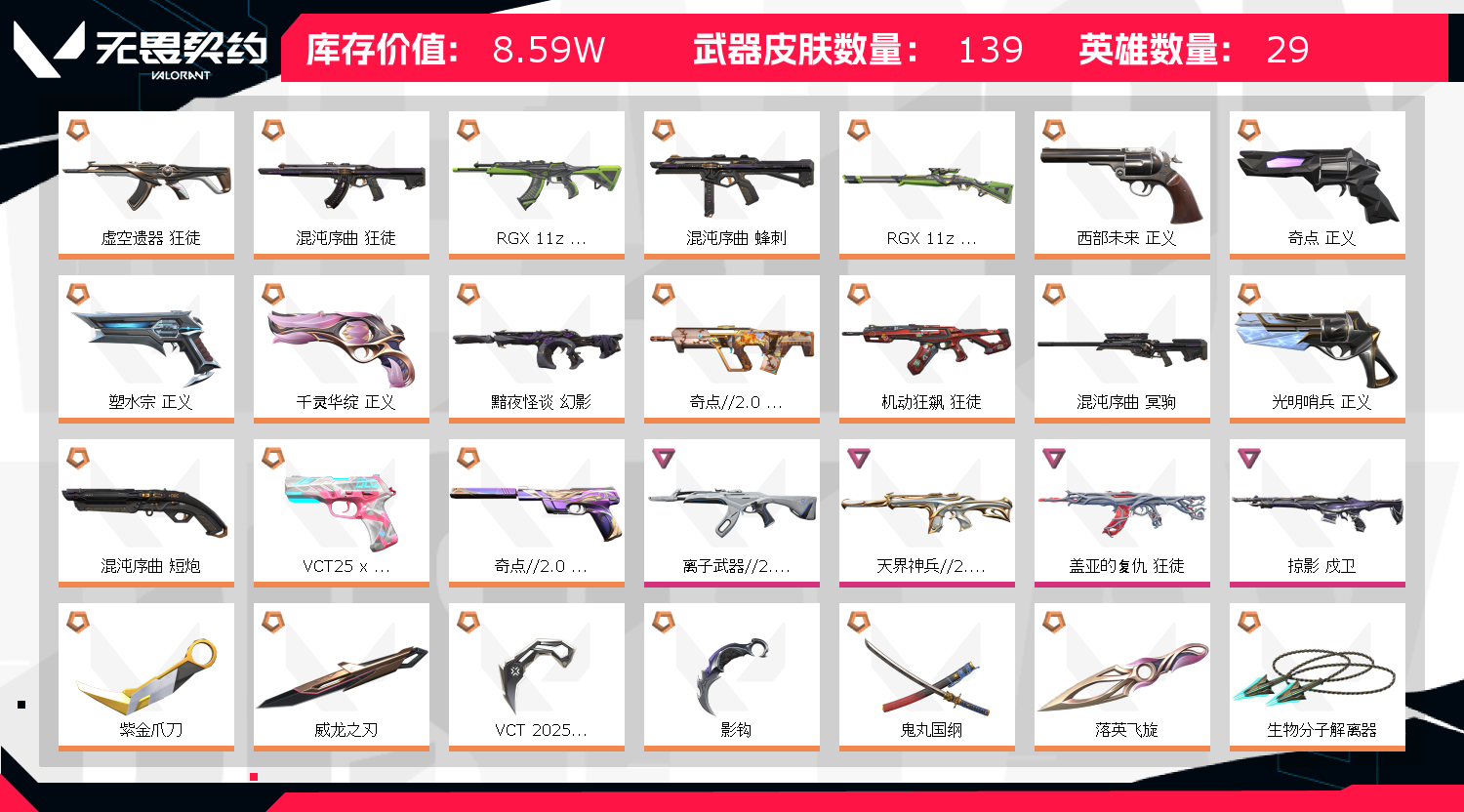 首页 > 租号大厅 > 无畏契约-wegame > wegame/wegame > 极品18刀✨显卡紫金VCT爪✨影钩落樱威龙蝴蝶刀✨盖亚紫金混沌狂徒掠影侦察幻影✨套装:奇点混沌掠影2