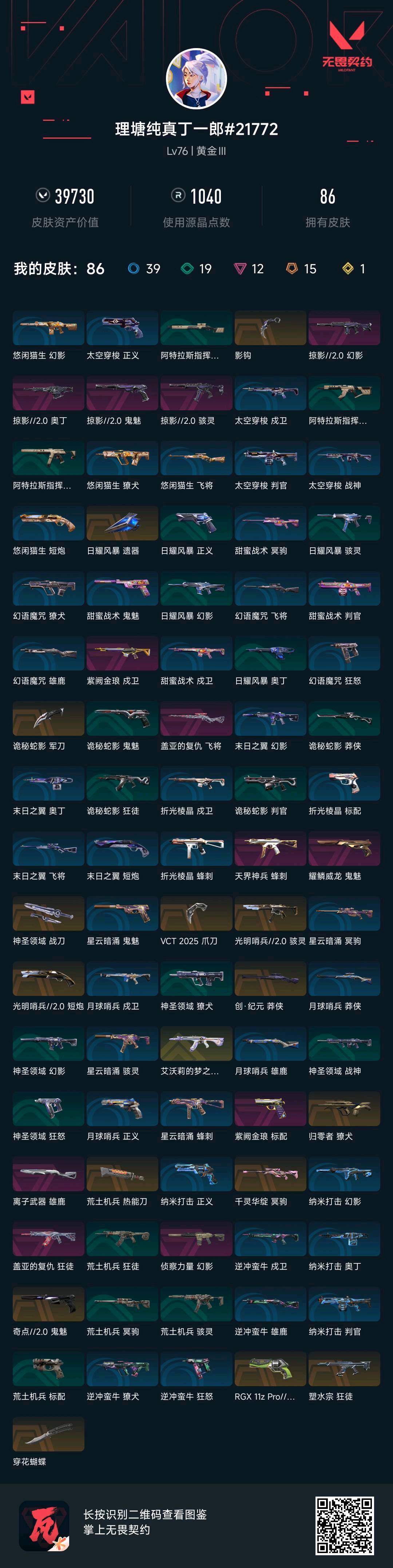允许 英雄27 武器皮肤数量86;VCT 2025 爪刀,归零者 獠犬,盖亚的复仇 狂徒,侦察力量 幻影,塑水宗 狂徒,天界神兵 蜂刺,紫阙金琅 标配,