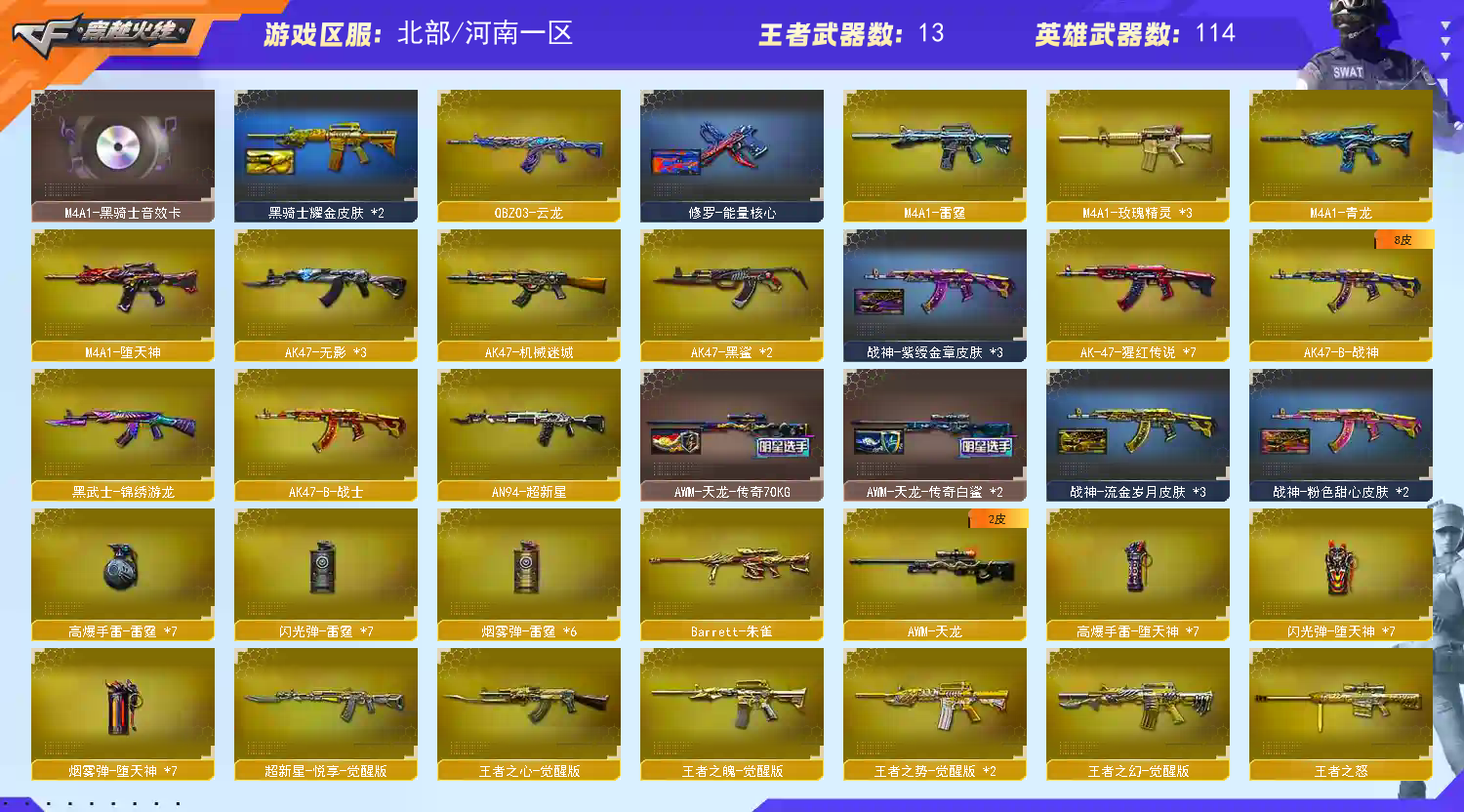130V12王者5炫金可排位/M200-幻神/Barrett-朱雀/M4A1-青龙/QBZ03-金色蔷薇/QBZ03-云龙/雷霆套装+7套雷霆雷/堕天神套装+COP-堕天神3把+7套堕天神雷/2盘龙1炼狱6烈龙+死亡之眼/AK47-火麒麟音效卡/M4A1-雷神音效卡/M4A1-黑骑士音效卡/Barrett-毁灭音效卡/雷神-星空/烈龙-星空/毁灭-星空/黑骑士耀金皮肤/毁灭耀金皮肤/修罗耀金皮肤/火麒麟-雷神/毁灭-AG-CFPLS15冠军/AK47-火麒麟-传奇EVEN/M4A1-战神赵云/火麒麟-冠军之心/火麒麟-AG战队/毁灭-冠军之怒/AK47-黑武士-361/M4A1-黑龙-361/毁灭-荣耀之怒/AWM-天龙-传奇白鲨/火麒麟-CFSTAR/AWM-天龙-传奇70KG/屠龙-荣耀之锋/雷神-白鲨-CFPLS14冠军/M4A1-雷神-精英刀锋/机甲撕裂者3/激光毁灭者3/巨龙咆哮3/王者之心觉醒/王者之翼/王者之影/王者之幻觉醒/王者之戮/王者之魄觉醒/王者之势觉醒/王者之光/王者之怒/王者之锋觉醒/王者之击觉醒/炫金火麒麟/炫金雷神/炫金毁灭/炫金修罗/葵/樱/炫/迷迭香/【长时效】烟雾保护头盔+闪光护目镜/炫彩背包/超级背包3-7+扩展背包/永久防弹衣+永久防弹头盔+永久C4工具钳;RPK-盘龙,QBZ03-金色蔷薇,M200-幻神,