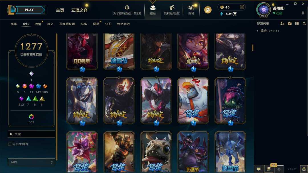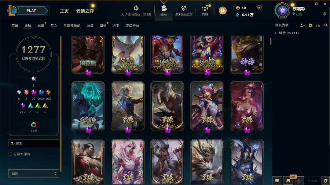 【泡泡】1850皮肤♥1277原皮♥569炫彩♥27神话♥30臻彩♥5终极♥242限定♥212史诗♥