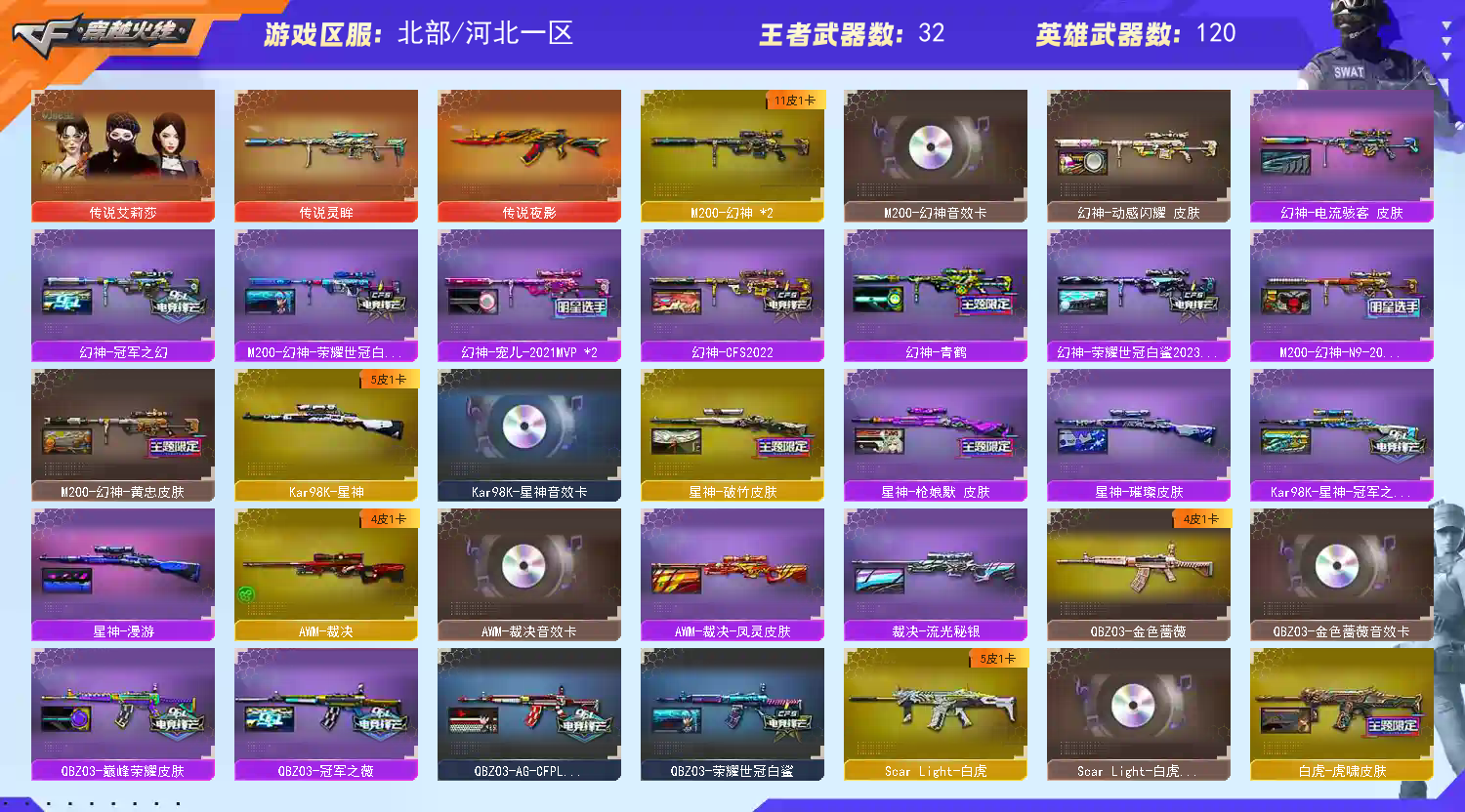 首页 > 租号大厅 > 穿越火线 > 网通区/河北一区 > 传说艾莉莎灵眸✨幻神音效11皮新白鲨冠幻✨星神三件套✨裁决三件套✨白虎蔷薇三件套✨幻影蝴蝶刀✨满手枪
