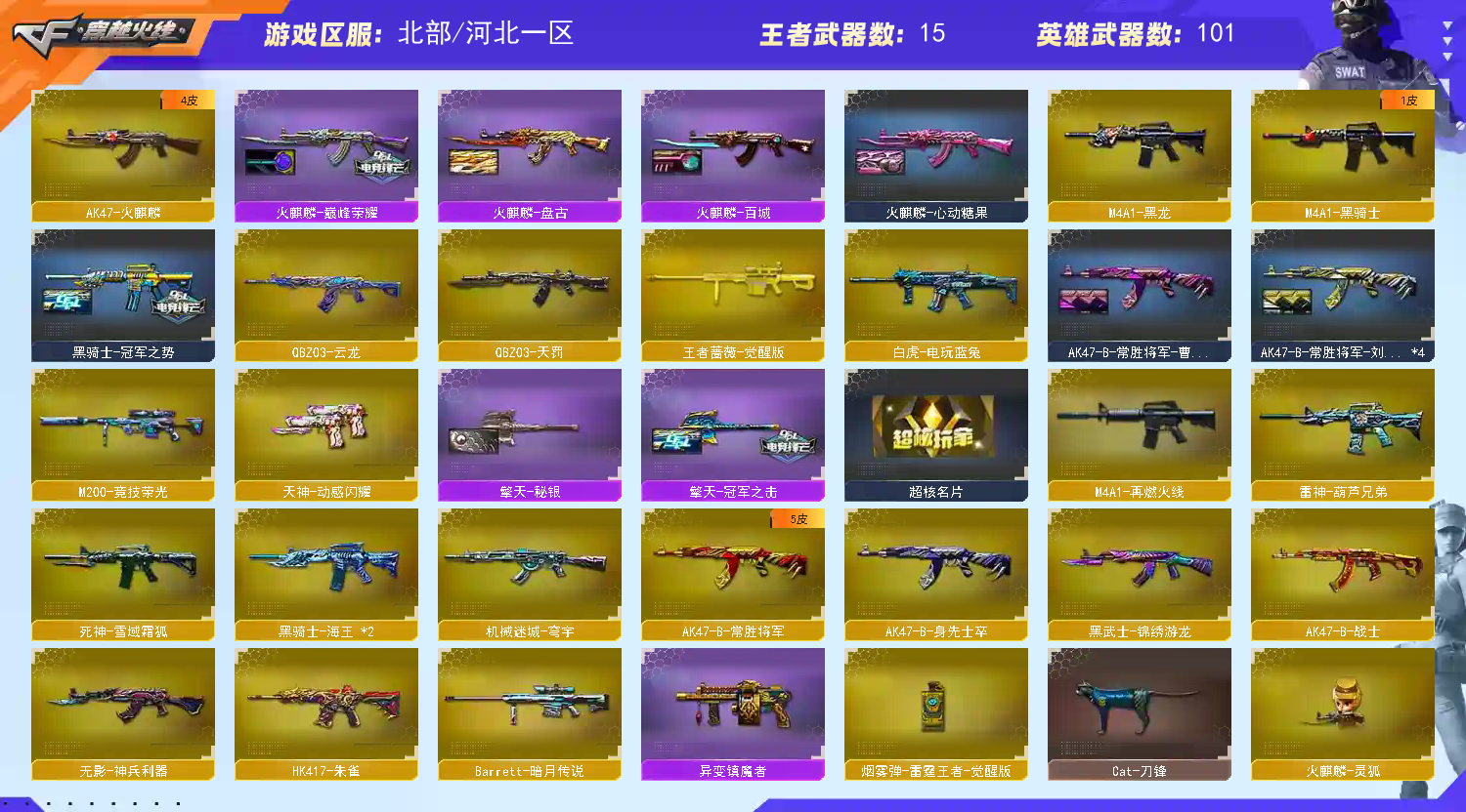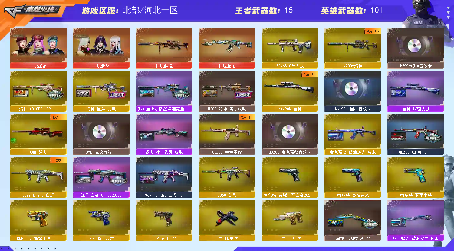 ★收藏好评!★ ━━━━━━━━ 由于异地登录保护机制,部分客户在使用客户端自动上号时会出现密码错误,注意本号密码不会错误 ,请多尝试5-6次!本账号已经过虚拟财产,请各位科技大神高抬贵手。请素质租号,文明游戏,谢谢大家配合!!!;柯尔特-荣耀世冠白鲨2023,柯尔特-冠军之特,炽芒蝶刃,传说影煞,传说星骇,RPK-盘龙,QBZ03-金色蔷薇,