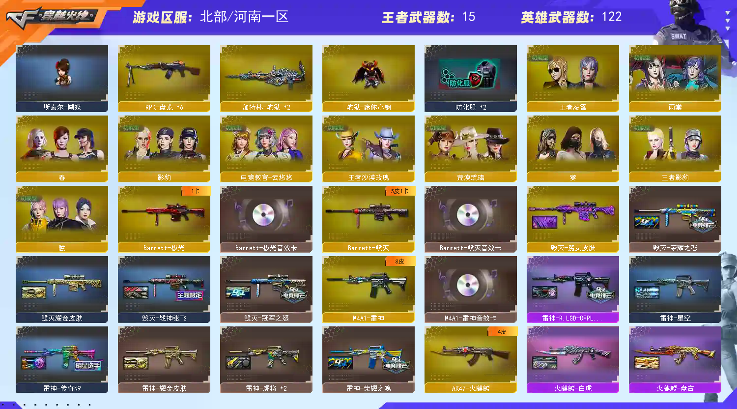 >>>>>>毁号,涉及毁坏虚拟财产罪及计算机安全罪,请文明游戏素质游戏,让我们共建美好租号平台>>>>>> 本游戏账号:英雄武器119个; 王者武器17个。 装备不多,但是主武器、副武器、近身武器够用 拥有完美游戏体验。重要的是,特殊装备有:闪光弹-竞技荣光、USP-雷暴、M200-竞技荣光、柯尔特-竞技荣光、烟雾弹-竞技荣光、荣耀世冠-柯尔特、传说光耀、传说暗裔、擎天-竞技荣光、传说圣灵、M200-幻神、麒麟刺、传说辉光、AK47-火麒麟、加特林-炼狱、HK417-朱雀、炫金毁灭、高爆手雷-雷霆王者、王者白虎-觉醒版、炫金骑士、炫金火麒麟、王者之魄-觉醒版、传说女帝、王者影豹、王者沙漠玫瑰、灵狐者-职业经理、M4A1-黑骑士音效卡、M200-幻神音效卡、M4A1-雷神音效卡、炼狱-悦蓝金色光效、生化弹匣、等,随意畅选。 注意事项: A.游戏过程中请不要恶意挂机或者不文明发言 B.恶意挂机、顶号等行为将被拉黑无法再次下单 C.进入游戏后中途请勿退出登陆,否则无法再次上号 D.部分账号由于异地登录可能会出现密码错误提示,通常再尝试5-6次后可上号 |||||||||喜欢本账号请点 ☆收藏☆ 方便下次租用,谢谢光临惠顾|||||||||;USP-雷暴,荣耀世冠-柯尔特,炽芒蝶刃,传说女帝,隼,电竞教官-云悠悠,王者沙漠玫瑰,