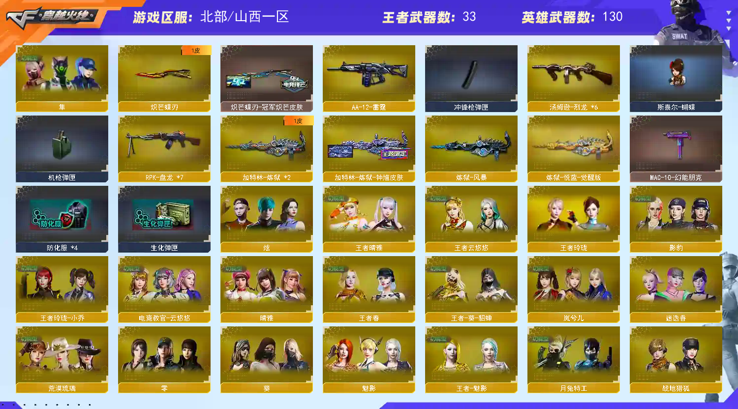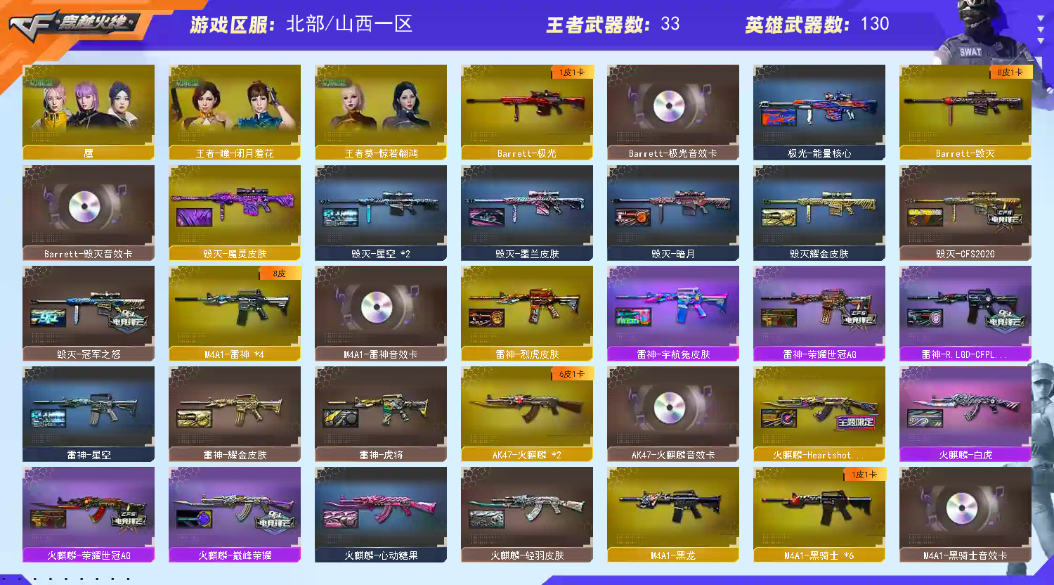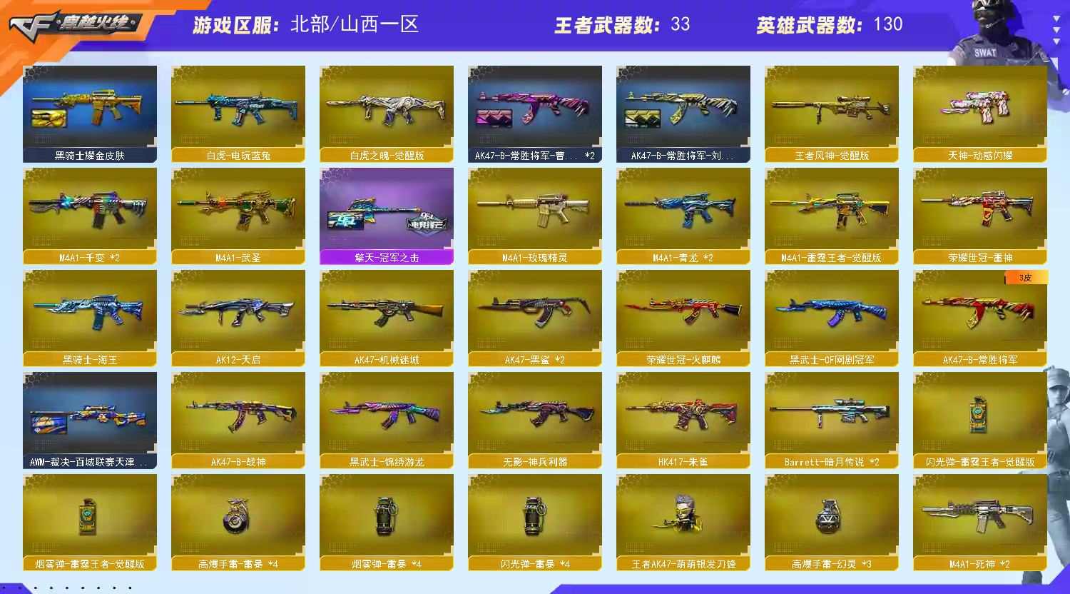 >>>>>>毁号,涉及毁坏虚拟财产罪及计算机安全罪,请文明游戏素质游戏,让我们共建美好租号平台>>>>>> 本游戏账号:英雄武器126个; 王者武器24个。 装备不多,但是主武器、副武器、近身武器够用 拥有完美游戏体验。重要的是,特殊装备有:M4A1-雷神、黑骑士-海王、M200-幻神、AK47-火麒麟、Barrett-朱雀、AA-12-雷霆、M4A1-玫瑰精灵、传说辉光、USP-雷暴、柯尔特-竞技荣光、荣耀世冠-柯尔特、荣耀世冠-雷神、荣耀世冠-火麒麟、荣耀世冠-龙啸、传说暗裔、Scar Light-白虎、COP 357-幻灵、幻灵之锋、传说圣灵、QBZ03-金色蔷薇、Kar98K-星神、M4A1-黑骑士、AWM-天龙、传说光耀、M4A1-青龙、麒麟刺、加特林-炼狱、HK417-朱雀、M4A1-黑龙、Barrett-毁灭、炫金毁灭、雷霆王者之锋-觉醒版、王者之心-觉醒版、Barrett-雷霆王者-觉醒版、COP 357-雷霆王者-觉醒版、M4A1-雷霆王者-觉醒版、高爆手雷-雷霆王者、炫金火麒麟、炼狱-悦蓝-觉醒版、炫金超新星、王者之势-觉醒版、炫金骑士、王者之锋-觉醒版、魅影、迷迭香 注意事项: A.游戏过程中请不要恶意挂机或者不文明发言 B.恶意挂机、顶号等行为将被拉黑无法再次下单 C.进入游戏后中途请勿退出登陆,否则无法再次上号 D.部分账号由于异地登录可能会出现密码错误提示,通常再尝试5-6次后可上号 |||||||||喜欢本账号请点 ☆收藏☆ 方便下次租用,谢谢光临惠顾|||||||||;USP-雷暴,荣耀世冠-柯尔特,炽芒蝶刃,传说影煞,传说女帝,隼,电竞教官-云悠悠,
