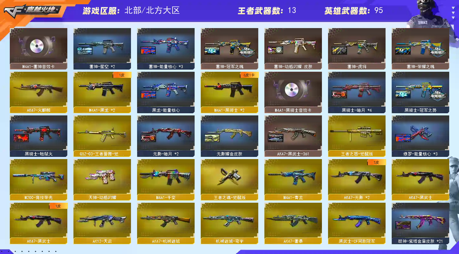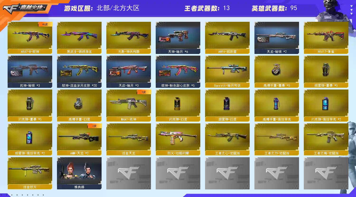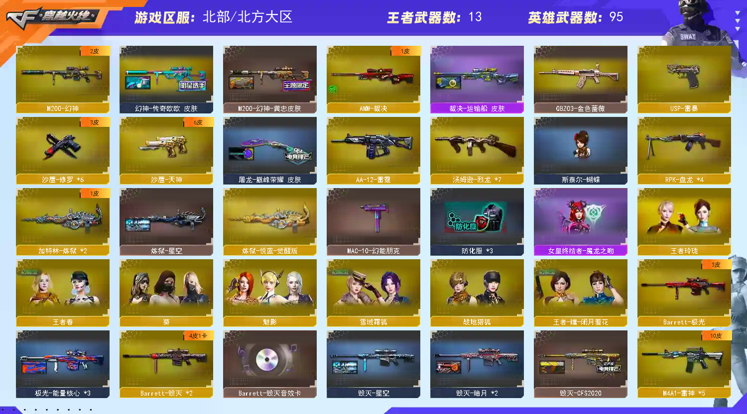 【M200-幻神带幻神-黄忠皮肤带幻神-传奇欧欧皮肤】【M200-竞技荣光】【QBZ金色蔷薇】【HK417-朱雀】【盘龙×4】【炼狱×2】【烈龙×7】【斯泰尔-蝴蝶】【USP-雷暴】【四防王者-春】狙击枪:【M200-幻神】【M200-竞技荣光】【天龙×2】【毁灭×2】【极光】【裁决】【王者之怒--王者之力】【Barrett-暗月传说】步枪:【QBZ金色蔷薇】【HK417-朱雀】【千变】【火麒麟】【黑龙×2】【雷神×5】【黑骑士×2】【AK47-无影×2】【M4A1-死神】【黑武士】【AK12-天启】【AN94-超新星】【AK47-机械迷城】【AK47-雷暴】【M4A1-青龙】【无影-神兵利器】【黑武士-锦绣游龙】【机械迷城-穹宇】【烈火-动感闪耀】【王者之心--王者之魄】【AK47-B-战神】【黑趋势-CF网剧冠军武器套装】【QBZ-03-王者蔷薇】【M4A1-赤狱骑士】【M4A1-苍鸣雷神】机枪:【盘龙×4】【炼狱×2】【炼狱-悦蓝】冲锋枪:【烈龙×7】【斯泰尔-蝴蝶】手枪:【USP-雷暴】【天神-动感闪耀】【王者之魂】【天神-CF网剧冠军武器套装】刀具:【屠龙×3】【擎天×2】【麒麟刺】【幻灵之锋】【屠龙-动感闪耀】【王者之击】【擎天-CF网剧冠军武器套装】手雷:【雷暴高爆手雷套×5 幻灵高爆手雷 竞技荣光高爆手雷 动感闪耀手雷 雷暴闪光弹手雷套×5 幻灵闪光弹手雷 竞技荣光闪光弹手雷套×2】音效卡:【黑骑士音效卡 雷神音效卡 毁灭音效卡】角色:【四防王者-春】【葵 魅影 战地猎狐 乔伊教练 蛇隐宗 王者-瞳-闭月羞花 王者玲珑 新海豹突击队 雪域霜狐】皮肤:【幻神-黄忠 幻神-传奇欧欧】【毁灭-枪娘格雷 毁灭-AG-CFPLS15冠军 毁灭-CFS2018 】【雷神-荣耀之魄 雷神-动感闪耀】【裁决-运输船】【屠龙-巅峰荣耀】【黑骑士-冠军之势】【毁灭-SV-CFPLS16冠军】;USP-雷暴,RPK-盘龙,QBZ03-金色蔷薇,M200-幻神,