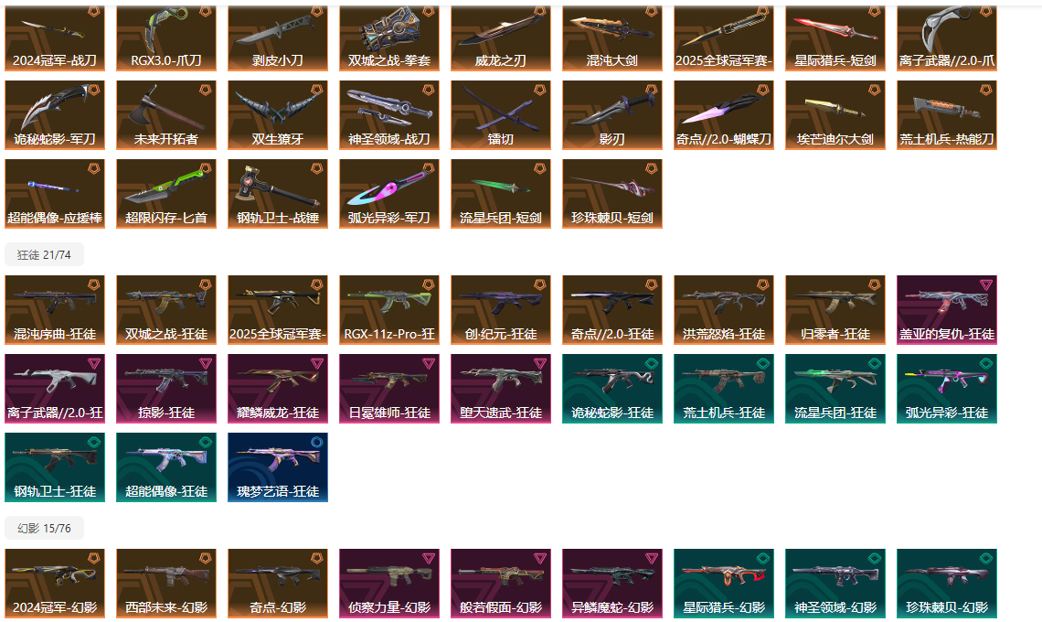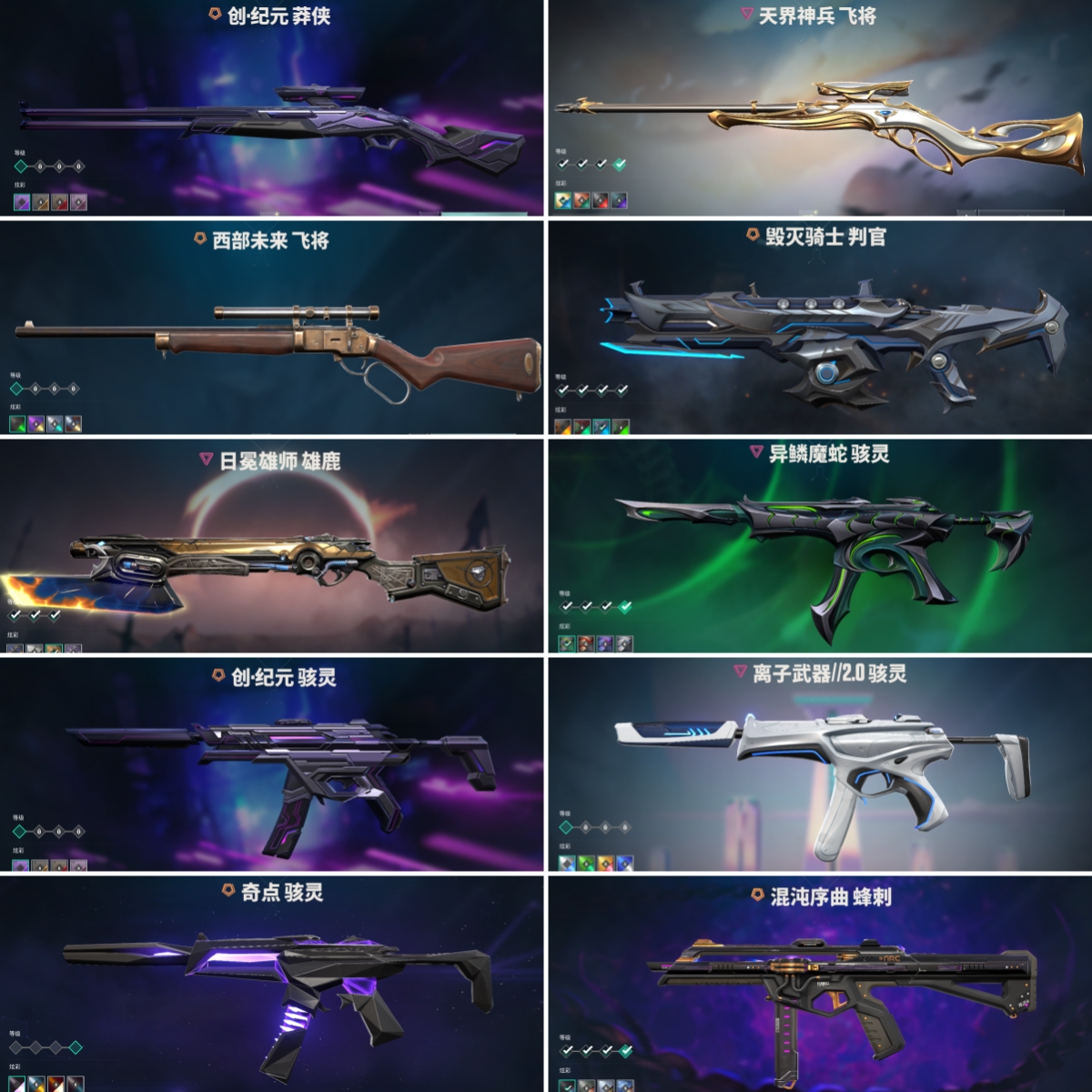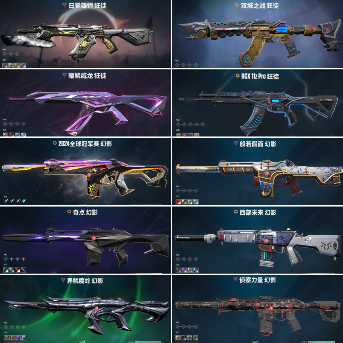 【拥有套装】离子武器//2.0套装(离子武器//2.0-狂徒,离子武器//2.0-战神,离子武器//2.0-骇灵,离子武器//2.0-狂怒,离子武器//2.0-爪刀)西部未来套装(西部未来-幻影,西部未来-奥丁,西部未来-飞将,西部未来-正义,未来开拓者)异鳞魔蛇套装(异鳞魔蛇-幻影,异鳞魔蛇-骇灵,双生獠牙)创纪元套装(创·纪元-狂徒,创·纪元-莽侠,创·纪元-骇灵,创·纪元-正义,镭切)混沌序曲套装(混沌序曲-狂徒,混沌序曲-冥驹,混沌序曲-蜂刺,混沌序曲-短炮,混沌大剑)双城之战套装(双城之战-狂徒,双城之战-拳套)奇点2.0套装(奇点//2.0-狂徒,奇点//2.0-鬼魅,奇点//2.0-蝴蝶刀)2025全球冠军赛套装(2025全球冠军赛-狂徒,2025全球冠军赛-蝴蝶刀