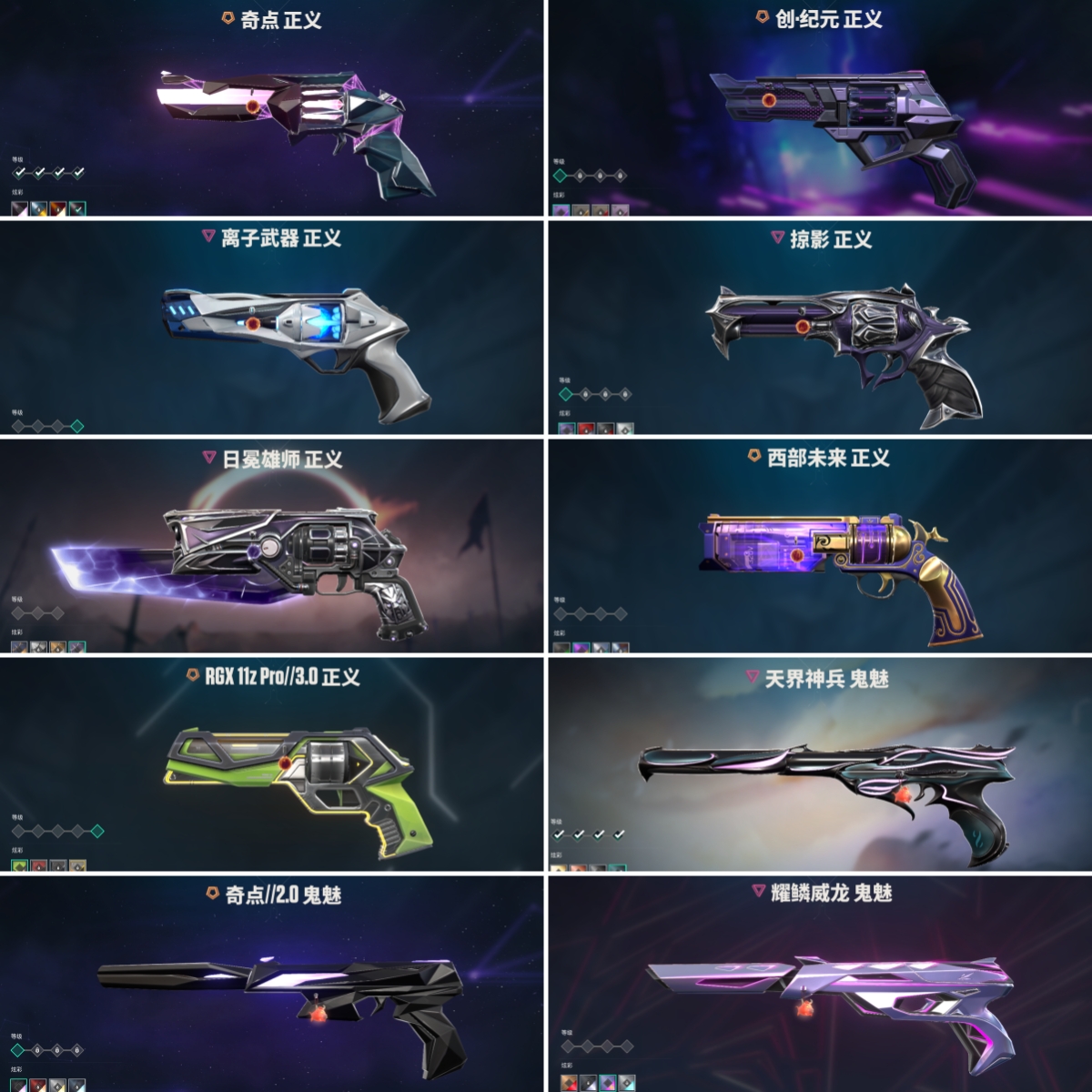 【拥有手枪】VCT25-x-LEV-标配,VCT-x-LEV-标配,奇点-正义,天界神兵-鬼魅,离子武器-正义,星际猎兵-标配,日耀风暴-正义,诡秘蛇影-鬼魅,神圣领域-狂怒,荒土机兵-标配,超限闪存-正义,超能偶像-标配,流星兵团-鬼魅,珍珠棘贝-狂怒,钢轨卫士-短炮,钢轨卫士-狂怒,沙尘幻旅-正义,弧光异彩-短炮,瑰梦艺语-鬼魅,光环序列-狂怒,末日之翼-短炮,折光棱晶-标配,星云暗涌-鬼魅,月球哨兵-正义,纳米击-正义,逆冲蛮牛-狂怒,浮光跃金-标配,模拟赫兹-鬼魅,聚合之力-狂怒,采蜜小蜂队-鬼魅,战术熊与伙伴们-标配,纤云弄巧-短炮,战术熊与伙伴们-狂怒,纤云弄巧-正义,复古浪潮-正义,深海水族-短炮,光导纤维-标配,光导纤维-鬼魅,彩梦之城-标配,信手涂鸦-鬼魅,