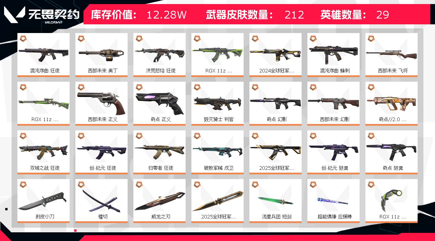 【卡面信息】万圣夜卡面,西部未来卡面,先驱者卡面,无畏契约吉祥物卡面,我眼中的世界卡面,分崩离析卡面,双城之战拥抱卡面,双城之战姐妹卡面,捣蛋鬼出卡面,情人节捷风卡面,RGX11zPro30卡面,超能偶像卡面,布鲁诺中校卡面,情人节不死鸟卡面,虹吸式咖啡壶卡面,VCTxLEV卡面,逆向独行卡面,耀鳞威龙卡面,Luie卡面,24冠军混沌黯夜怪谈艾沃莉源能者电玩显卡套塑水宗归零者盖世套光明哨兵机动狂飙全息波普破败军械掠夺掠影无畏奇点2.0白银青铜黄金黑铁砖石铂金神话盖亚洪荒离火刃毁灭骑士VCT爪刀创纪元镭切虚空遗器离子2.0西部未来蝴蝶刀黑波显卡AK无畏光荣异象RGX 11Z PRO奇点正义23盖亚铂金22冠军苍龙之刃21冠军超时空卫士掠影2.0影钩赋能掠夺爪显卡AK滋滋X特工队25冠军混沌2.0;西部未来 奥丁,剥皮小刀,镭切,威龙之刃,盖亚的复仇 狂徒,掠影 戍卫,洪荒怒焰 狂徒,
