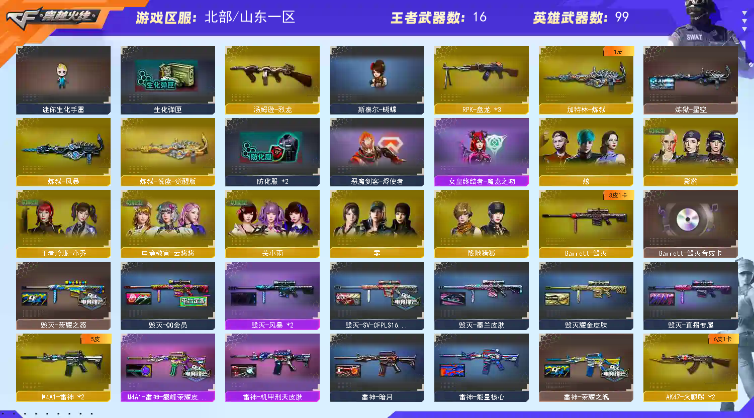 极品爆破号;USP-雷暴,传说女帝,电竞教官-云悠悠,传说艾莉莎,RPK-盘龙,QBZ03-金色蔷薇,M200-幻神,
