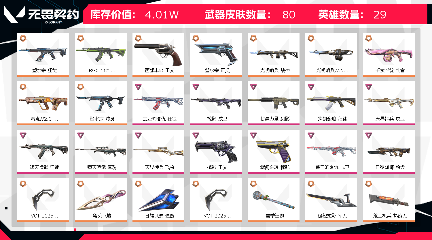 🔥冻结请点击协助,会自动解冻,等几分钟重新登陆即可! 🔥请勿挂机,游戏中挂机拉黑!!! 🔥账号R点请勿使用,本店铺及时补充新套装,若使用R点无法升级新套装,攒R点辛苦,望谅解! 老板不要杀太多,现在风控的严重,杀多了会临时冻结,到时候我可能不在无法解冻!使用外挂脚本导致游戏账号封禁直接向平台提取ip地址! ***本账号经过网络财产备案,一经发现直接报警处理立案追责,根据账号价值全额赔偿感谢支持谢谢合作谢谢合作!!!!禁止利用账号进行开挂、使用辅助违规软件诈骗等违规操作!;VCT 2025 爪刀,盖亚的复仇 狂徒,掠影 戍卫,侦察力量 幻影,紫阙金琅 狂徒,RGX 11z Pro 狂徒,天界神兵 戍卫,