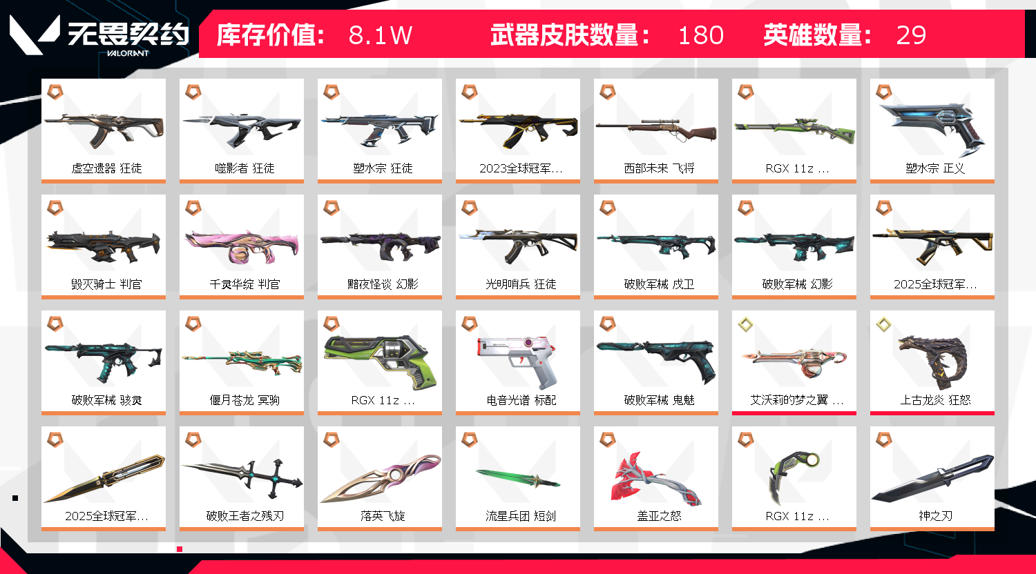首页 > 租号大厅 > 无畏契约-wegame > wegame/wegame > 精氪毕业皮齐全特效拉满25冠军套✅RGX显卡套✅破败套✅盖亚套✅塑水宗侦查力量噬影者✅神之刃电音光谱