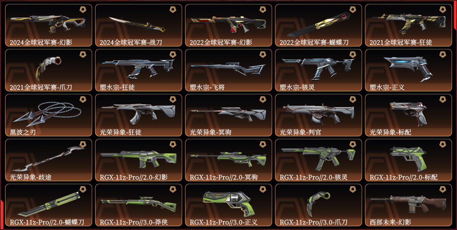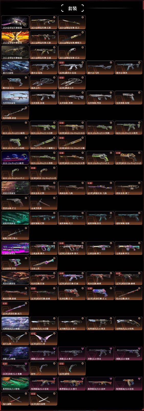 【拥有套装】掠影//2.0套装(掠影//2.0-幻影,掠影//2.0-奥丁,掠影//2.0-骇灵,掠影//2.0-鬼魅,影钩)2022全球冠军赛套装(2022全球冠军赛-幻影,2022全球冠军赛-蝴蝶刀)光荣异象套装(光荣异象-狂徒,光荣异象-冥驹,光荣异象-判官,光荣异象-标配,光荣异象-歧途)西部未来套装(西部未来-幻影,西部未来-奥丁,西部未来-飞将,西部未来-正义,未来开拓者)破败军械套装(破败军械-幻影,破败军械-戍卫,破败军械-骇灵,破败军械-鬼魅,破败王者之残刃)塑水宗套装(塑水宗-骇灵,塑水宗-狂徒,塑水宗-飞将,塑水宗-正义,黑波之刃)全息波普套装(全息波普-獠犬,全息波普-奥丁,全息波普-判官,全息波普-狂怒,全息匕首)般若假面2.0套装(般若假面//2.0-狂徒,般若假面//2.0-獠犬,般若假面//2.0-战神,般若假面//2.0-狂怒,鬼丸国纲)机动狂飙套装(机动狂飙-狂徒,机动狂飙-蜂刺,机动狂飙-雄鹿,机动狂飙-正义,机动狂飙-战刀)光明哨兵2.0套装(光明哨兵//2.0-幻影,光明哨兵//2.0-奥丁,光明哨兵//2.0-骇灵,光明哨兵//2.0-短炮,圣石匕首)2024全球冠军赛套装(2024全球冠军赛-幻影,2024全球冠军赛-战刀)2021全球冠军赛套装(2021全球冠军赛-狂徒,2021全球冠军赛-爪刀)RGX-11z-Pro//3.0套装(RGX-11z-Pro//3.0-莽侠,RGX-11z-Pro//3.0-正义,RGX-11z-Pro//3.0-爪刀);西部未来 奥丁,奇点 战神,黑波之刃,5周年//公测重制版 苍龙之刃,剥皮小刀,威龙之刃,VCT 2025 爪刀,