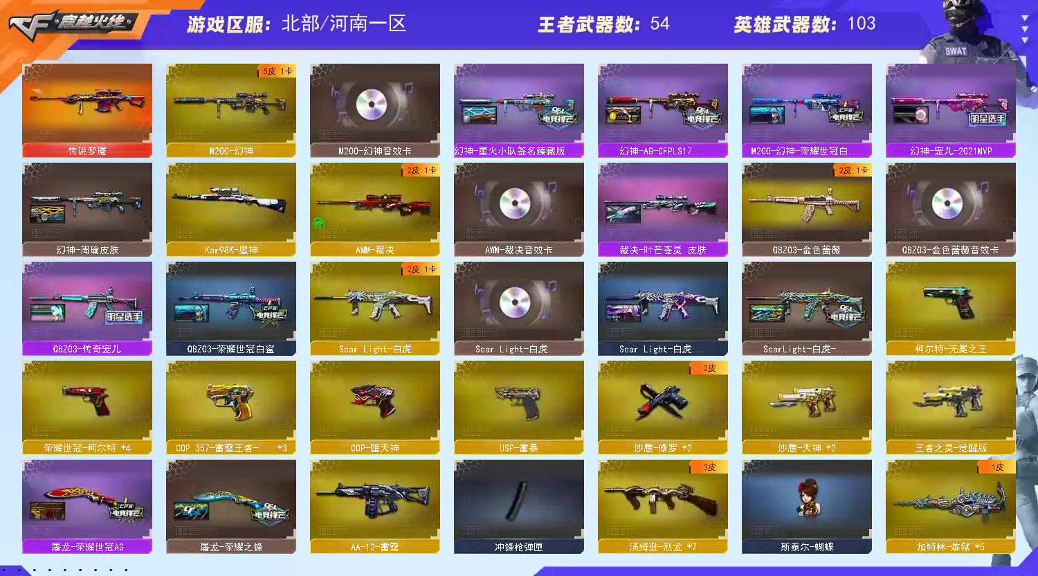 禁止一切外挂;USP-雷暴,柯尔特-无冕之王,荣耀世冠-柯尔特,电竞教官-云悠悠,QBZ03-金色蔷薇,M200-幻神,Scar Light-白虎,