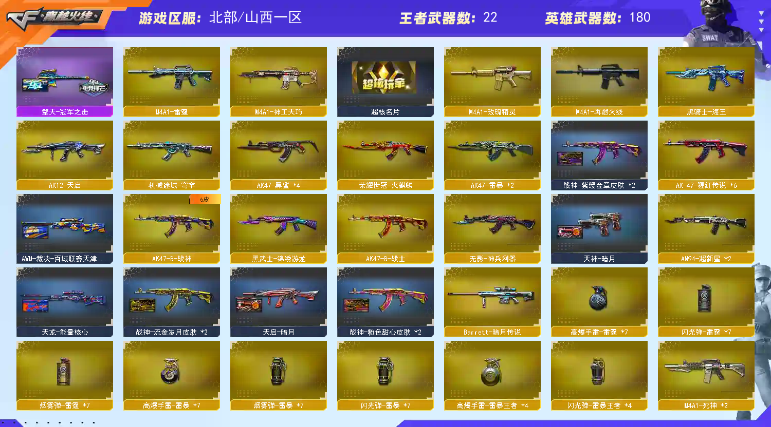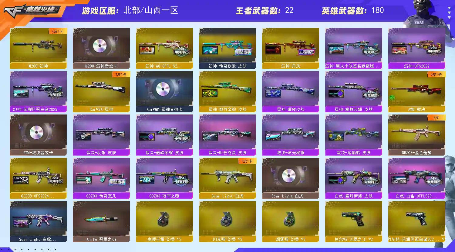 各位老板装备皮肤太多看截图 【温馨提示]此号价值数十万,已向公安机关报备,如有开G开辅助封号的,由平台提供,身份信息,证据和地址进行报警处理并依法追究责任!祝各位老板玩得开心。请使用官方启动,更快捷稳定上号。恶意下单维权及检测到外挂将无法再次下单!【温馨提示]排位比赛请勿中途退出游戏,一经发现拉黑处理。【温馨提示]如租号时长不足,请勿再开启排位或及时续租,避免禁排,如发现时长不足恶意开启排位,拉黑处理。[温馨提示]如遇到账号冻结,请申请号主协助,号主三分钟之内会解除。祝各位文明租号的租客身体健康,万事如意,玩的开心!;USP-雷暴,柯尔特-无冕之王,柯尔特-荣耀世冠白鲨2023,炽芒蝶刃,Knife-冠军之刃,RPK-盘龙,QBZ03-金色蔷薇,
