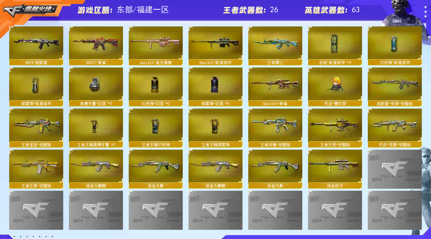 【幻神6皮肤!!!】【金色蔷薇三件套!!!】【m200幻神+冠军之幻皮肤*2+巅峰荣耀皮肤+cfs2022+荣耀世冠白鲨皮肤+纸灯笼皮肤+黄忠皮肤+冠军之特+王者风神】 【98k星神+呛娘默皮肤+王者星神】【传说圣灵】 【白虎+白虎音效卡+白虎之魄】 【qbz03金色蔷薇+金色蔷薇音效卡+巅峰荣耀皮肤+荣耀世冠白鲨皮肤+冠军之特+冠军之刃】 【电竞装甲皮肤】 【王者霜心 王者蔷薇 王者芳薇 王者冰魄 王者龙血 王者之势 王者森绝 王者之光】 【火麒麟+火麒麟音效卡+巅峰荣耀皮肤+冠军之心皮肤】 【雷神+雷神音效卡+荣耀之魄皮肤+巅峰荣耀皮肤+cfpls18冠军皮肤】 【黑骑士+黑骑士音效卡+冠军之势皮肤+s4典藏皮肤】 【毁灭+荣耀之怒皮肤+2020mvp皮肤】 【极光+极光音效卡】【千变 天启 超新星 武圣 黑鲨 青龙 朱雀 玄武 神兵利器 烈火 天启悦智 猩红传说 白虎电玩蓝兔 芭蕾特朱雀 炼狱 雷霆】——【冠军之特 cop357幻灵 武圣 柯尔特电竞装甲】——【冠军之刃 龙啸 擎天 麒麟刺 尼泊尔电竞装甲 幻灵之锋 王者之锋 龙啸烈火龙威】——【电竞装甲投掷武器套装*3 幻灵投掷武器套装*2】——【炫金火麒麟 炫金无影 毁灭孙三炮 天龙曼陀罗 炫金毁灭 斯泰尔蝴蝶 斯泰尔呛娘暗刃 awm灵狐15周年嘉年华】——【角色】【4芳(影豹 岚兮儿 王者春 王者潘多拉 王者葵貂蝉 王者沙漠玫瑰 王者涂鸦 王者影豹 职业经理)】 【晴雅 沙漠玫瑰 司雨 鹰 雨棠】;柯尔特-冠军之特,Knife-冠军之刃,沙漠玫瑰,晴雅,王者沙漠玫瑰,QBZ03-金色蔷薇,M200-幻神,