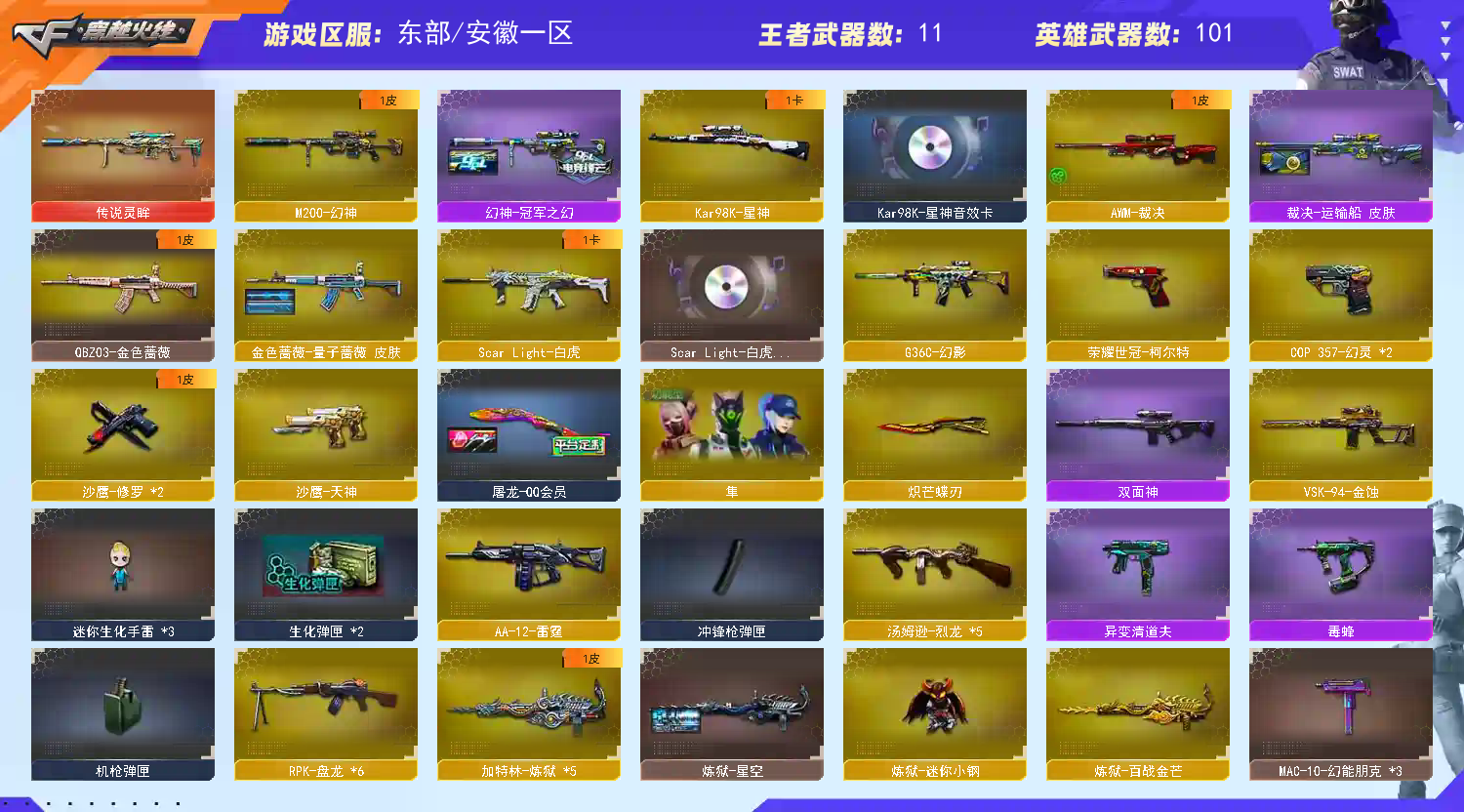 编号:AH302东部安徽一区生化爆破全装✅四防隼+传说灵眸+幻神+6烈异变清道夫+6盘炼狱+炽芒蝶刃✅银翼+带卡星神+荣耀世冠柯尔特+2把COP🔥 稀有武器:传说灵眸、M200幻神、98K星神、VSK金蚀、G36C幻影、QBZ银翼、M4A1青龙、Scar白虎、QBZ金色蔷薇、火麒麟、雷神X2、黑骑士、无影、天启、幻灵、无影神兵利器、超新星热带奇洋、死神雪域霜狐、机械迷城穹宇、烈火X3、毁灭、裁决、6把盘龙、炼狱X6、烈龙X6、雷霆、修罗X2、天神、COP幻灵X2、荣耀世冠柯尔特、屠龙、麒麟刺、炽芒蝶刃、幻灵之锋、云龙扇、擎天云海游龙、龙啸热带奇洋、麒麟刺百战金芒、龙啸烈火龙威、AWM昌龙、M4A1赤狱士、M4A1苍鸣雷神、Barrett碧霄极光 稀有角色:四防隼(佣兵觉醒/捕食者之眼/生化觉醒 /生化背包变更)、关小羽(四防:减少闪光效果+免疫队友炸弹伤害+减少掉落伤害+副武器自动装弹)、机械姬、樱、影豹、零纪元、战地猎狐、葵阿尔法武装、奇洋探员、修道士、雪域霜狐、云海玲珑 音效卡:星神音效卡、黑骑士音效卡、毁灭音效卡、Scar白虎音效卡、超新星热带奇洋音效卡、碧霄极光音效卡、擎天云海游龙音效卡、死神雪域霜狐音效卡、龙啸热带奇洋音效卡、炼狱百战金芒音效卡、雷神音效卡、昌龙怀旧音效卡 稀有皮肤:幻神冠军之幻皮肤、金色蔷薇量子蔷薇皮肤、雷神巅峰荣耀皮肤/源计划2.0皮肤/暗月皮肤/再燃火线皮肤/RLGDCFPLS18冠军皮肤/耀金皮肤、裁决运输船皮肤、天启暗月皮肤、火麒麟雷神皮肤/心动糖果皮肤/平天大圣皮肤/CF STAR皮肤/Q员皮肤/STAR皮肤X2/再燃火线皮肤、修罗能量核心皮肤/CF STAR皮肤X2、无影耀金皮肤、毁灭墨兰皮肤/员皮肤、黑骑士AGS4冠军典藏皮肤/暗月皮肤、屠龙惊鸿皮肤/Q员皮肤、炼狱星空皮肤 王者炫金武器:王者芳薇、王者冰魄、王者之势、王者之魂、王者之刺、炫金雷神、炫金毁灭 投掷套装:幻灵套X7、云海游龙套、云龙套、热带奇洋套、雷霆王者套X2 小人枪武器特殊武器:火麒麟零纪元X2、炼狱迷你小刚、毒蜂、异变清道夫、KAC锯式机枪黑桃战神、死亡之眼、AWM灵狐15周年嘉年华、;荣耀世冠-柯尔特,炽芒蝶刃,隼,RPK-盘龙,QBZ03-金色蔷薇,G36C-幻影,M200-幻神,