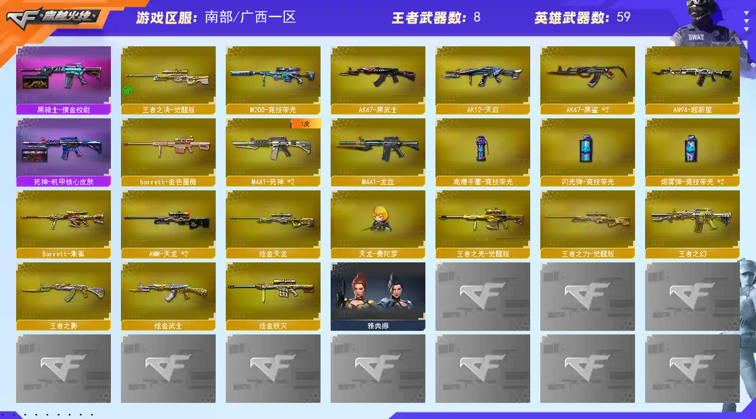 【主武器】M200-幻神/98K-星神/M200-幻神竞技荣光/②蔷薇/炼狱/⑥烈龙⑥盘龙/火麒麟/黑龙/②雷神/黑骑士/②死神/黑武士/天启/超新星/②黑鲨/龙血/②蔷薇qbz/②天龙/②毁灭/极光/裁决/朱雀大炮/蔷薇大炮/王者之光觉醒版/王者之力觉醒版/王者之决觉醒版/王者之幻/王者之影/炫金武士/天龙曼陀罗/炫金毁灭/炫金天龙/毁灭征服者超越Max/冰龙/神圣爆裂者末日3/激光毁灭者3/加特林机械猎手/金色小号/M37葵/ 【副武器}】⑥修罗/天神/王者之灵/②COP旗袍/涂鸦手枪 【近身武器】王者之击觉醒版/王者之啸觉醒版/屠龙/④龙啸/③麒麟刺/黄金尼泊尔/手斧镜 【投掷武器】迷你生化手雷/高爆竞技荣光+烟闪 【角色】隼/王者魅影/瞳/樱/炫/战地猎狐/王者春/蛇隐宗/空/兰海滩派对/对讲机/炫彩背包/真龙戒/圣龙戒/魔龙戒 【皮肤】幻神-电流骇客皮肤/幻神-黄忠皮肤/毁灭-荣耀之怒-SVCFPLS16冠军皮肤/雷神-星空皮肤 【音效卡】毁灭音效卡/火麒麟音效卡 【道具】元首/全背包/VIP/AC/烟雾头/变异宝贝/疯狂宝贝/灵魂忍者/绿巨人/迷雾幽灵/全弹夹/地狱终结者-妲己皮肤/机械猎手-幻灵猎姬皮肤/生化爆破全装;隼,RPK-盘龙,QBZ03-金色蔷薇,M200-幻神,Kar98K-星神,