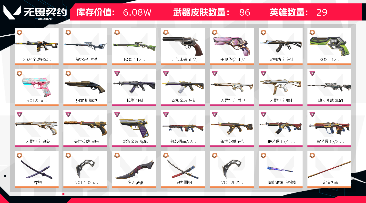 你好,我是广东省东营市公安局文汇派出所的小华同志,温馨提示: 故意毁坏他人虚拟财物,数额较大或者有其他严重情节的,处三年以下有期徒刑、拘役或者罚金;数额巨大或者有其他特别严重情节的,处三年以上七年以下有期徒刑。 文明租赁游戏账号,请勿租赁游戏账号开挂。 ❤️❤️❤️❤️❤️❤️❤️❤️祝你游戏愉快!!!!! 出现上号显示游戏断连就是冻结请反馈耐心等待1分钟 不要存在侥幸心理,不要给自己找麻烦。感谢!;镭切,VCT 2025 爪刀,掠影 狂徒,紫阙金琅 狂徒,天界神兵 戍卫,2024全球冠军赛 幻影,天界神兵 蜂刺,