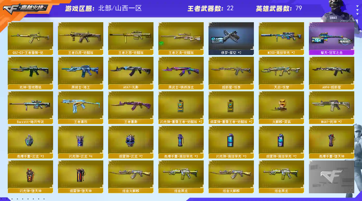 北部-【山西一区】【可二次】【V武器数88】【传说幽瞳X2】【M200-幻神+荣耀世冠白鲨2023 +星火小队签名臻藏版 +星耀+曹操 皮肤】【Kar98K-星神+星神音效卡】【Scar Light-白虎+巅峰荣耀+霓虹机甲+白虎音效卡】【王者白虎】【QBZ03-金色蔷薇+量子蔷薇 +破浪逐光+金色蔷薇音效卡】【QBZ-03-王者蔷薇】【王者芳薇】【八面凌龙】【QBZ191-银翼游侠】【M14EBR-玄武】【柯尔特-无冕之王】【柯尔特-竞技荣光】【COP 357-云龙】【炽芒蝶刃+荣耀世冠白鲨2023 +破浪逐光 皮肤】【Knife-冠军之刃】【黄金猫猫手套-白鲨】【USP-铃狮送福】【泡泡象COP357】【电竞教官-云悠悠】【华】【晴雅】【司雨】【王者潘多拉】【王者雾萌萌】【王者樱-热浪之夏】【雨墨】【月兔特工】【隼】【M4A1-雷神+白鲨皮肤+HeartShot +CFS十周年纪念版 +宇航兔皮肤+耀金皮肤+源计划2.0专属 皮肤+雷神音效卡】【AK47-火麒麟+Heartshot+传奇石头-横秒之巅+轻羽+大唐荣光+CFSTAR】【M4A1-黑骑士+冠军之势+破界 皮肤+黑骑士音效卡】【M4A1-黑龙+冠军之武+墨子皮肤】【Barrett-毁灭+Heartshot皮肤+SV-CFPLS16冠军+星空+百城浙江 +秦师 +虹光风暴 +梦蝶 +毁灭音效卡】【幻神4皮】【白虎三件套】【金色蔷薇三件套】【竞技荣光套装X3套】【堕天神套装X1套】【堕天神套装X1套】【云龙套装X3套】;柯尔特-无冕之王,炽芒蝶刃,Knife-冠军之刃,隼,电竞教官-云悠悠,晴雅,QBZ03-金色蔷薇,