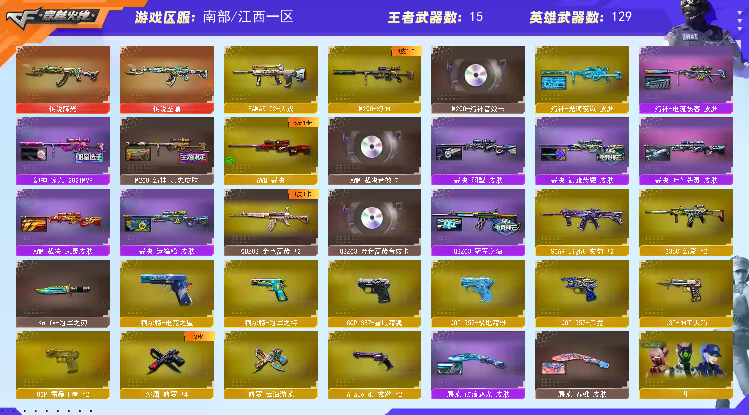 幻神透明皮幻影天戎玄豹蔷薇;USP-雷暴王者,柯尔特-冠军之特,Knife-冠军之刃,隼,RPK-盘龙,QBZ03-金色蔷薇,G36C-幻影,