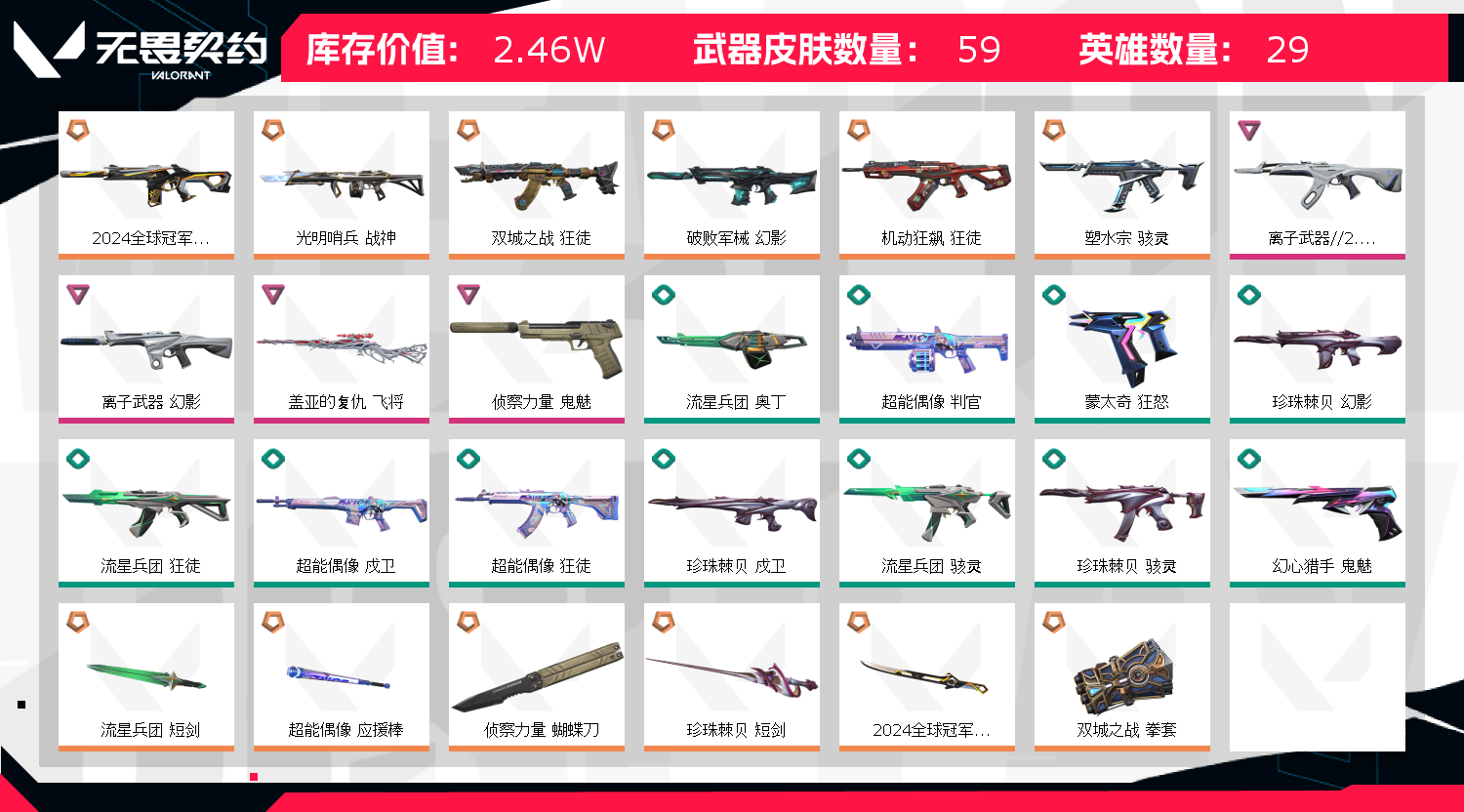 首页 > 租号大厅 > 无畏契约-wegame > wegame/wegame > 24冠军 双城 破败幻影 摩托ak 塑水骇灵 光明哨兵战神