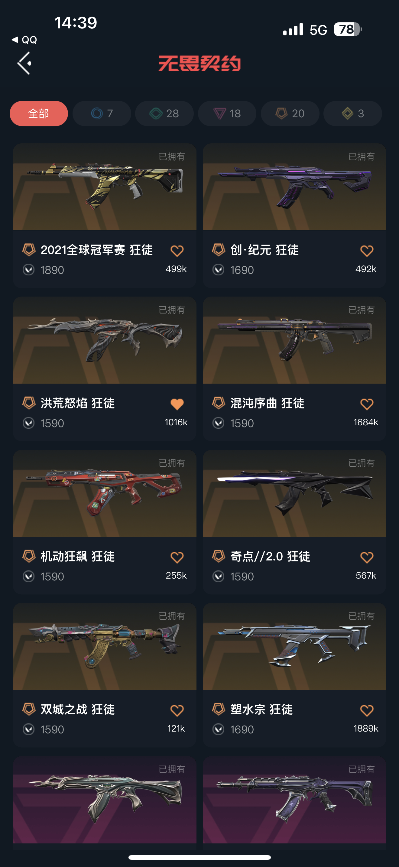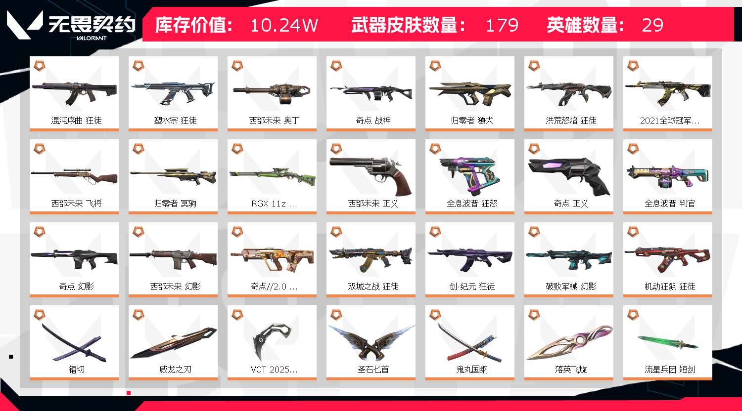 不允许 英雄28 武器皮肤数量178;西部未来 奥丁,奇点 战神,镭切,威龙之刃,VCT 2025 爪刀,起源 雄鹿,归零者 獠犬,